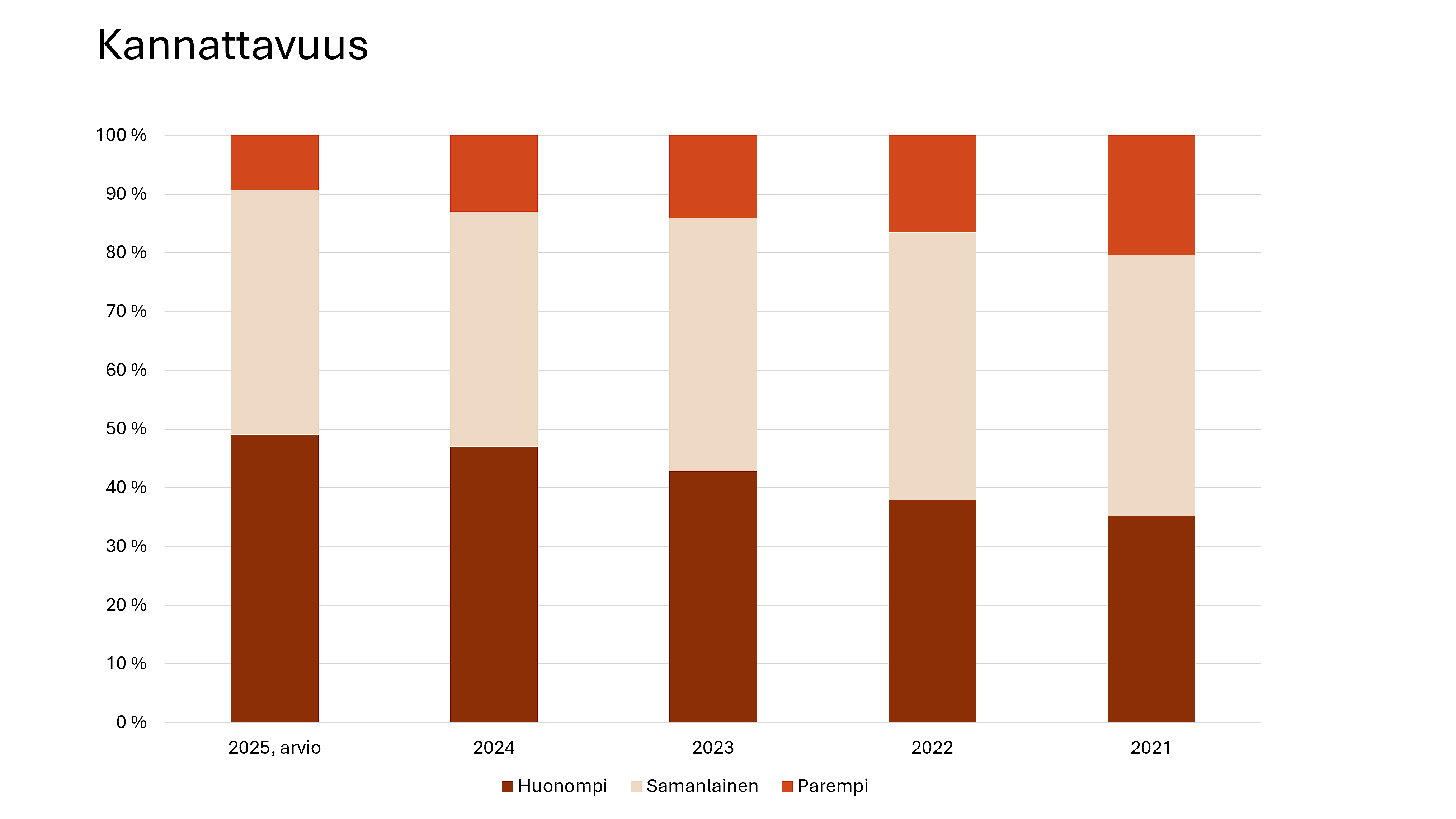 Odotukset kannattavuuden kehityksestä ovat heikentyneet keväästä. Puolet vastaajista arvioi kannattavuutensa laskevan ja vain 9 prosenttia arvioi sen paranevan.