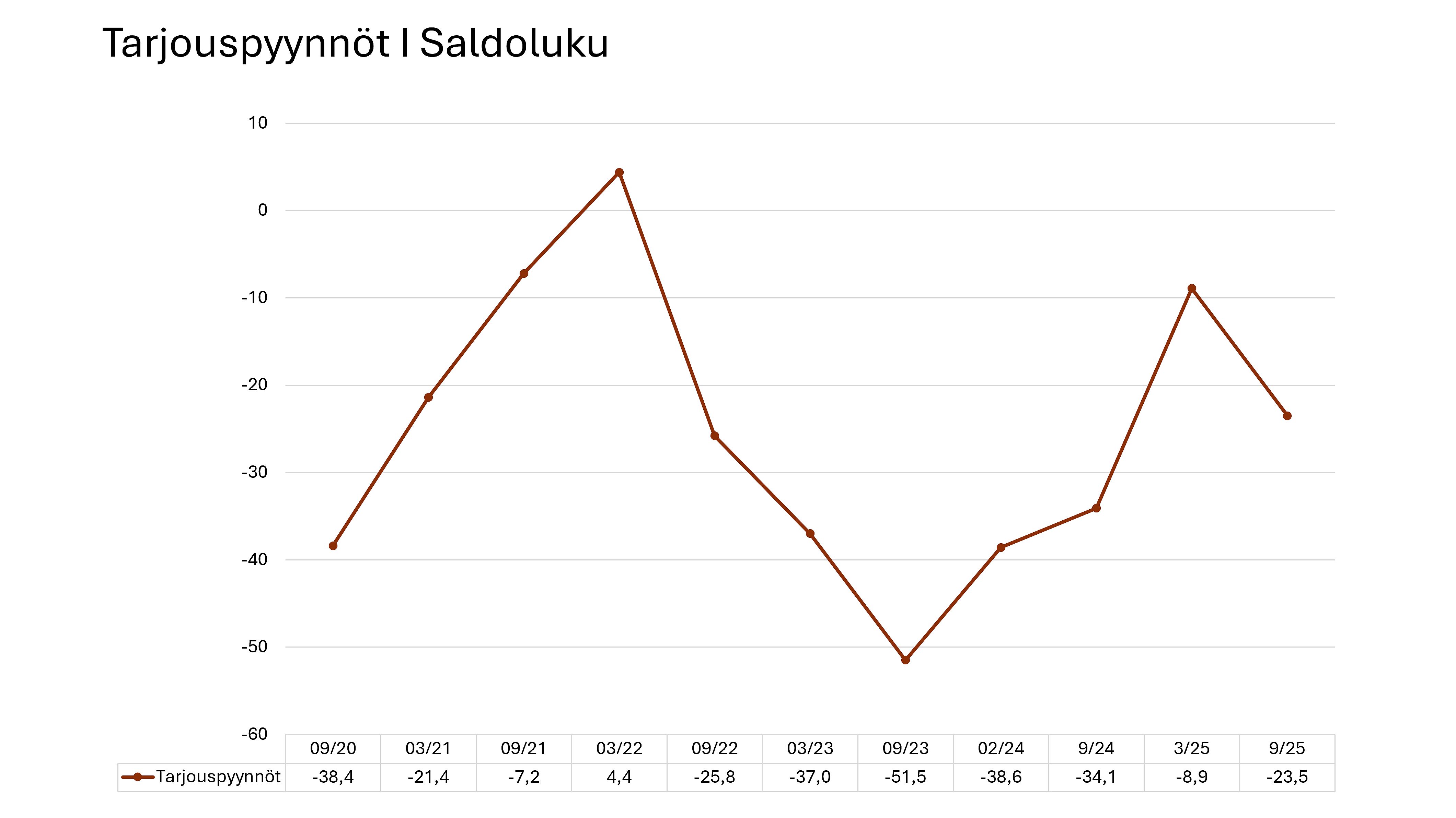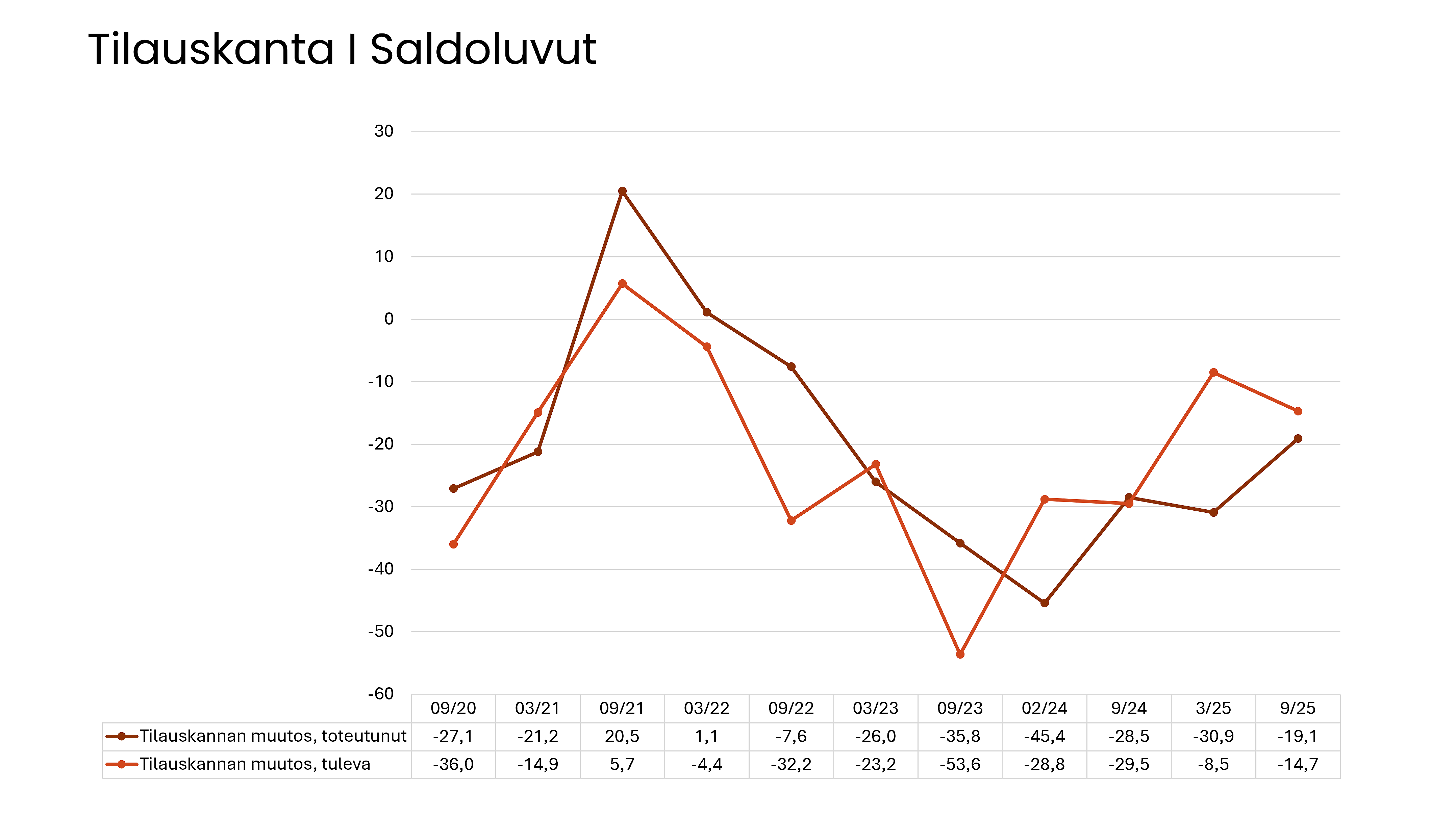 Tilauskanta on laskenut keväästä 2025 varsinkin isoimmilla toimijoilla. Suunnittelijoilla tilauskanta on laskenut eniten ja myös kannattavuus kehittyy väärään suuntaan. Suunnittelun tilauskanta ennustaa rakentamista 3–9 kk päähän ja kuvastaa tilannetta rakennuslupien ja rakennusten aloitusten ennusteen kanssa.