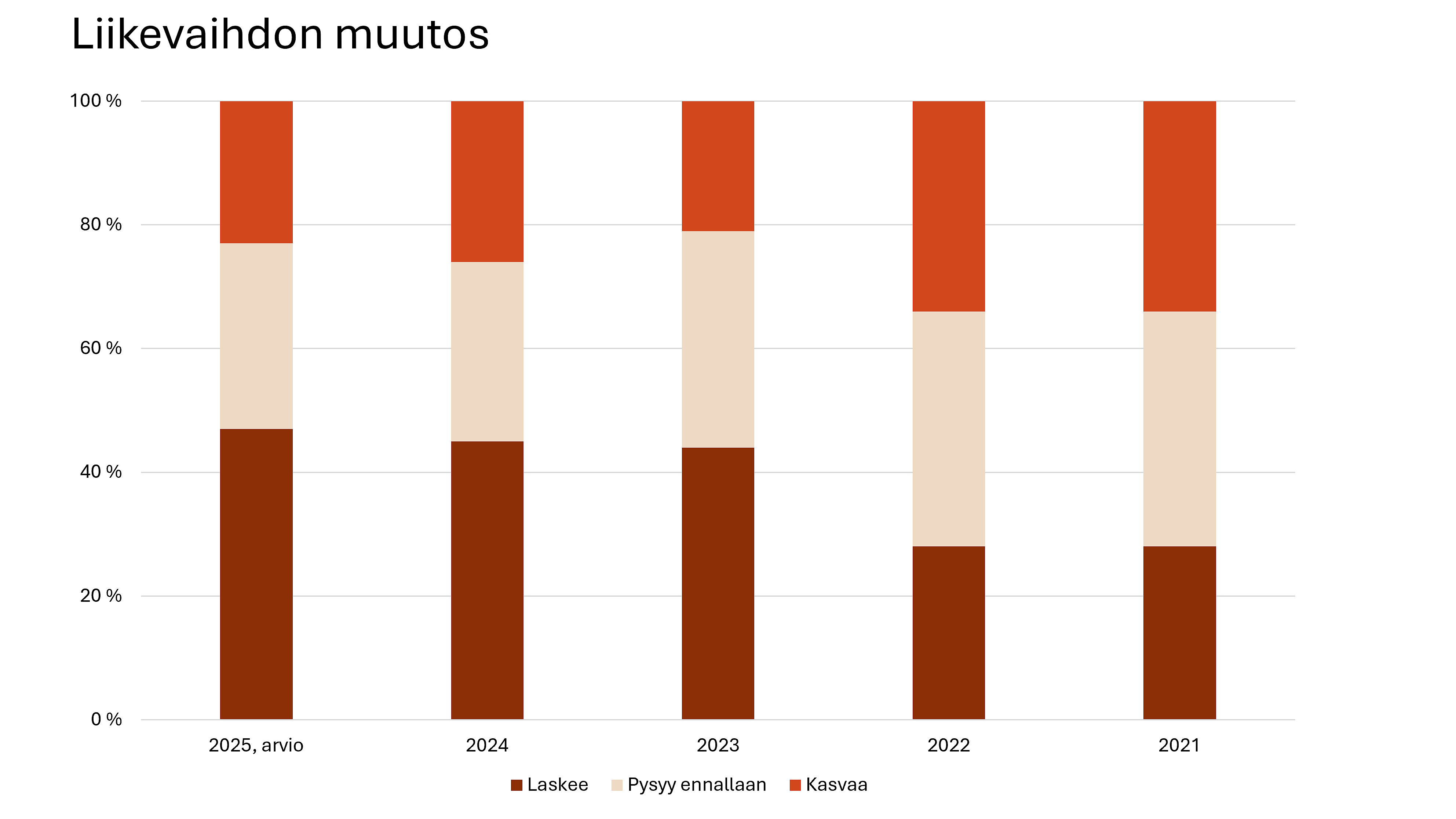 Lähes joka toinen vastaaja arvioi liikevaihtonsa laskevan. Isoimmista toimijoista yli puolet odottaa liikevaihtonsa kasvavan. Sen sijaan liikevaihdoltaan pienimmistä vastaajista yli puolet odottaa liikevaihtonsa laskevan, ja vain yksi kymmenestä odottaa kasvua.