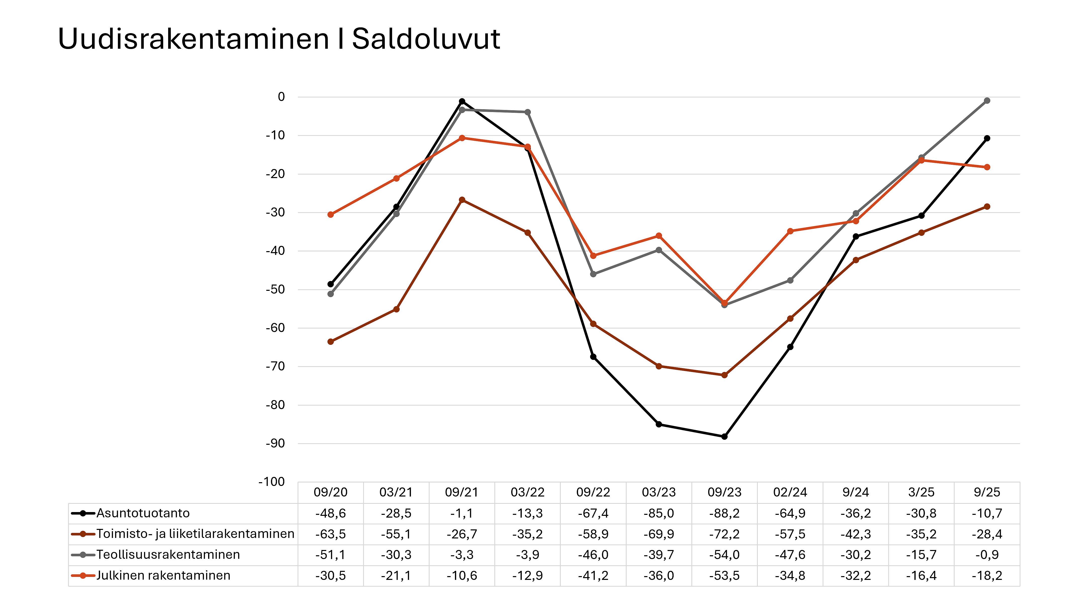 Uudistuotannon laskusuhdanteesta huolimatta näkymät ovat hieman positiivisemmat kuin keväällä (saldoluvut syksyllä -14,6 ja keväällä -24,5), varsinkin asunto- ja teollisuusrakentamisessa. Sen sijaan julkisen rakentamisen sekä toimisto- ja liiketilarakentamisen näkymät ovat edelleen heikot. Myös valtakunnalliset erot ovat merkittäviä: erityisesti Itä-Suomessa nostokurjet eivät juurikaan liiku.