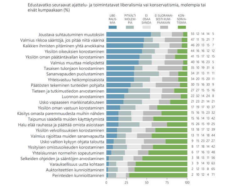 Suomalaisten mielissä liberalismi ja konservatismi muodostavat selkeän vastinparin. Selvä enemmistö suomalaisista katsoo suvaitsevaisuuden (63 %), moniarvoisuuden (62 %) ja uudistusmielisyyden (61 %) edustavan ensisijaisesti liberalismia. Reilun kymmenesosan mielestä nämä arvot edustavat sekä liberalismia että konservatismia, mutta hyvin harvan mielestä konservatismia tai eivät kumpaakaan.