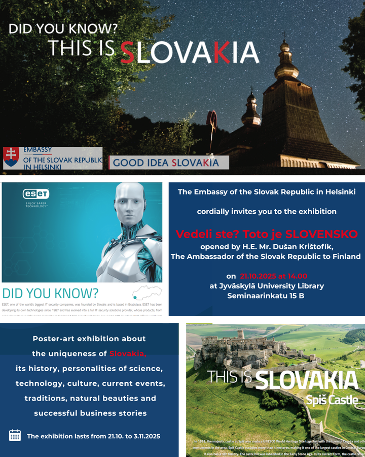 "Did you know? This is Slovakia" -julistenäyttely esittelee Slovakian ainutlaatuisuutta: sen historiaa, tutkijoita, teknologiaa, kulttuuria, tapahtumia, perinteitä, luonnonkauneutta ja menestyksekkäitä yritystarinoita.