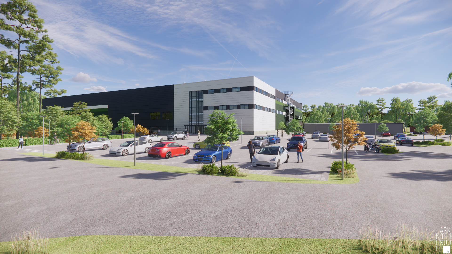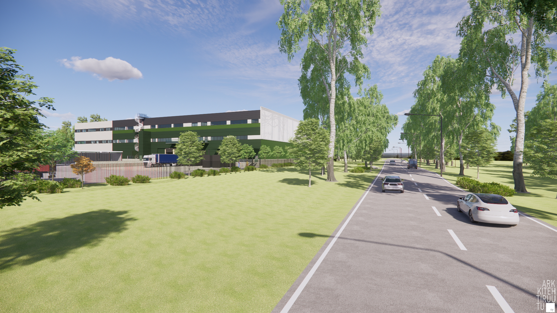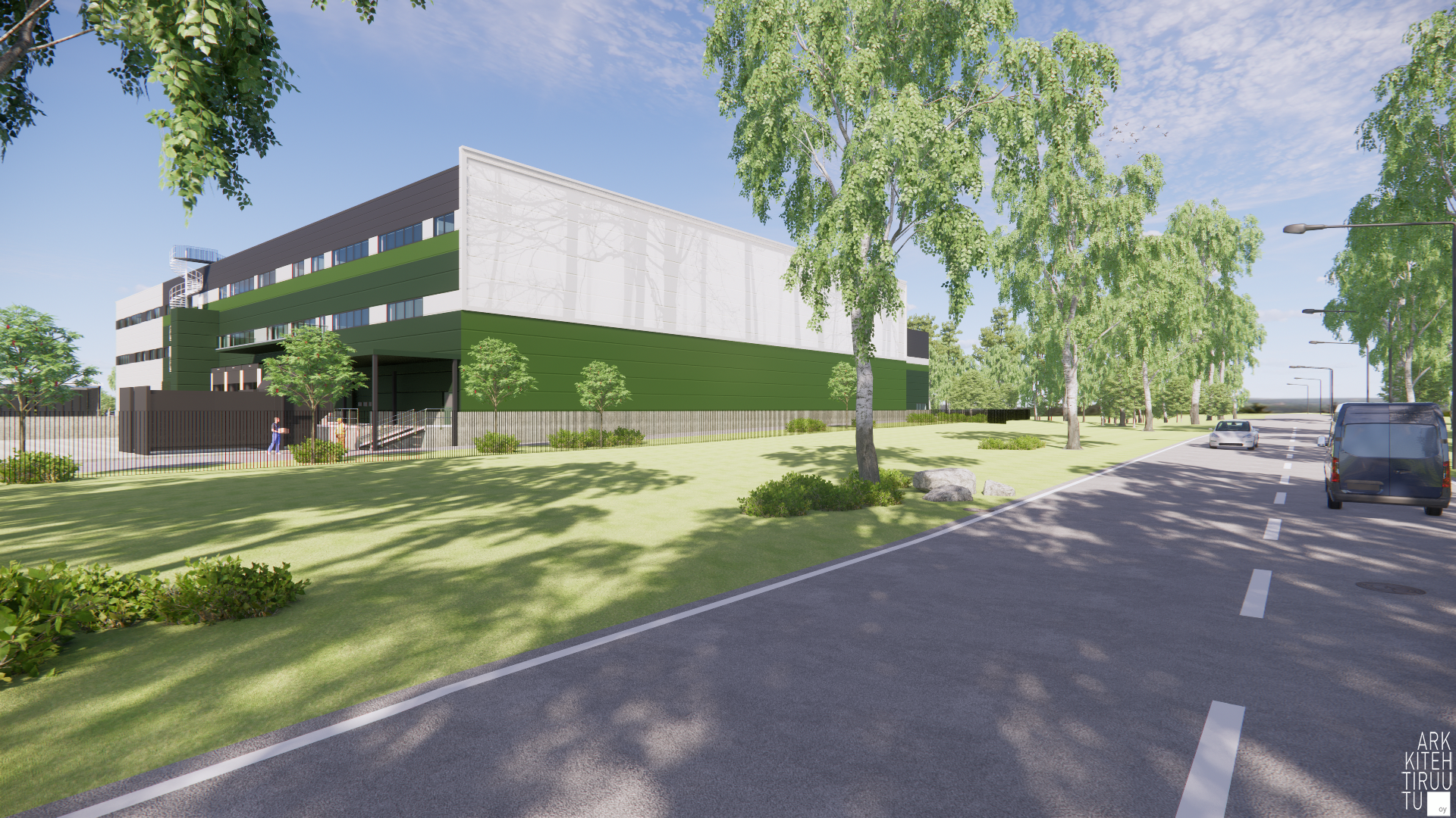Havainnekuva uudesta Logicentersin tuotanto- ja logistiikkarakennuksesta. Arkkitehtiruutu Oy