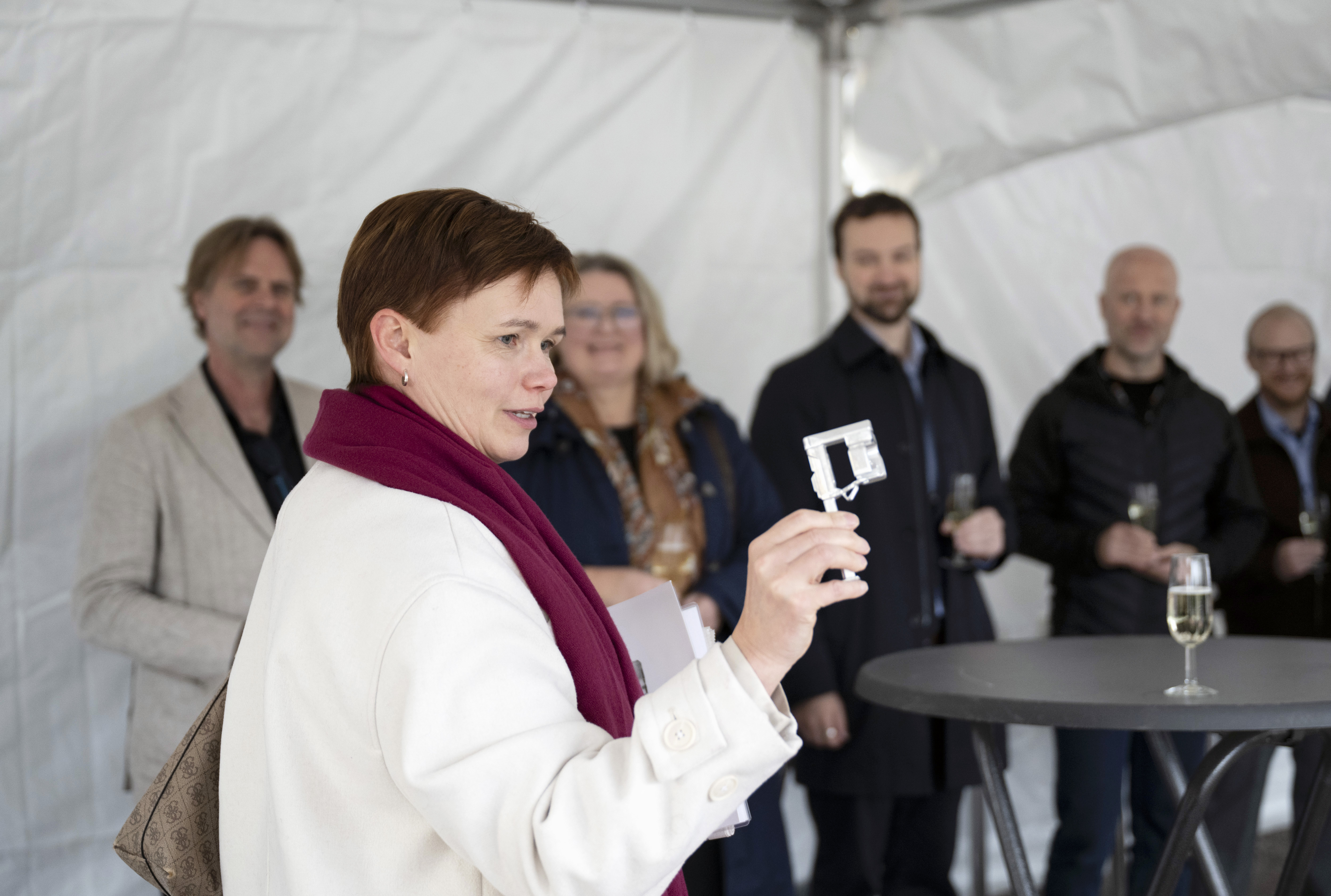 DEXISin operatiivinen johtaja Leena Mäkisalo esittelee, mitä esineitä muurattavaan ”aikakapseliin” on valittu, muun muassa DEXISin valmistama hammaskuvantamisen apuväline.