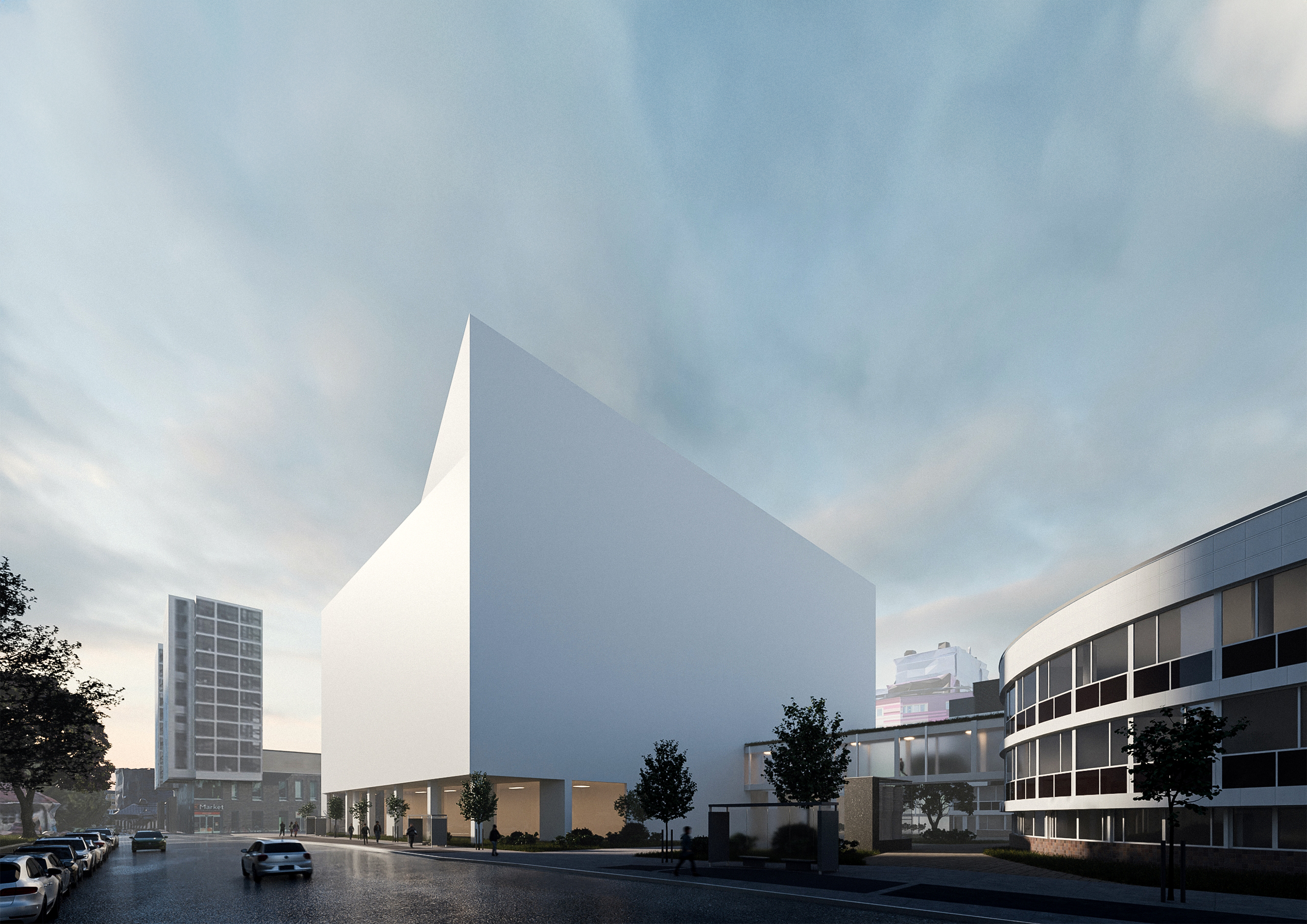 Havainnekuva Uusi Dentalia -kokonaisuudesta. Kuvassa uudisrakennus on havainnollistettu nk. massamallina, josta puuttuvat vielä ikkunat. Julkisivu tarkentuu suunnittelun edetessä. Havainnekuva: Arkkitehdit Kontukoski Oy