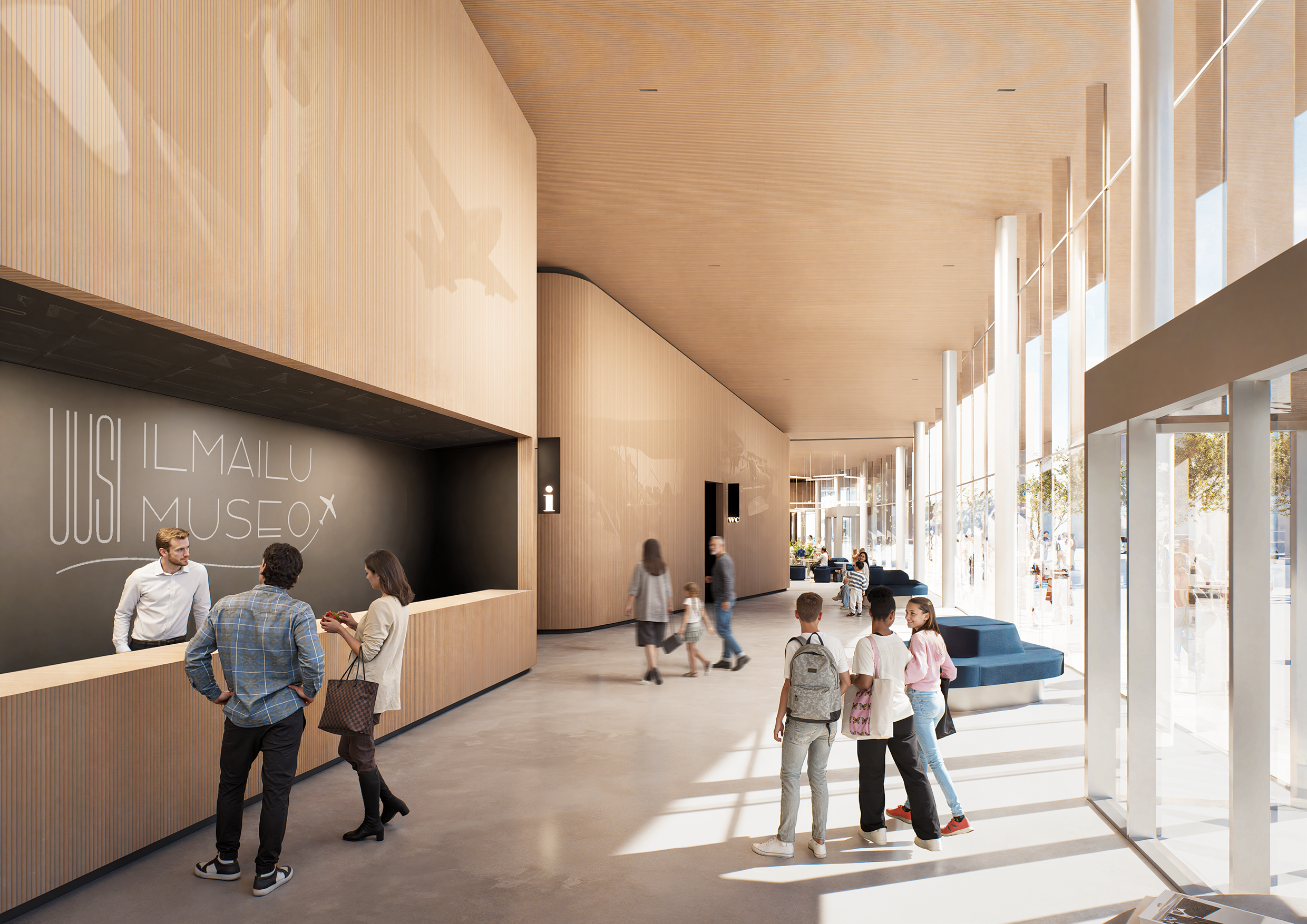 Pääjulkisivun maltillisesti kohoava julkisivulinja kutsuu museovierailulle. Aulasta löytyvät toiminnot kuten kahvila ja museokauppa elävöittävät Aviabulevardia.