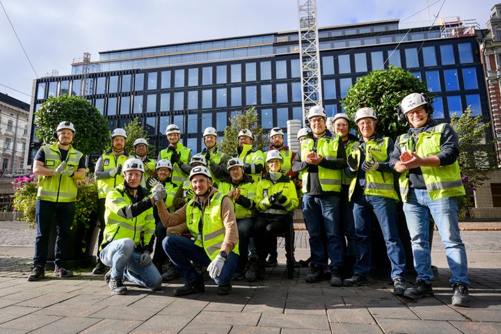 Kuva: Jatkeen pääurakoiman M14 Signe -työmaan voittajajoukkuetta Helsingin ydinkeskustaan rakentuvan toimisto- ja liiketilakiinteistön edessä.