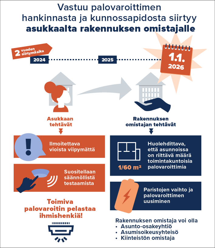 Palovaroittimia koskevat vastuut muuttuvat 1.1.2026 alkaen. Tuolloin palovaroittimien hankinta- ja kunnossapitovelvollisuus siirtyy huoneiston haltijalta rakennuksen omistajalle. Majoitus- ja hoitolaitoksissa vastuu säilyy edelleen toiminnanharjoittajalla. Muutokset koskevat erityisesti asunto-osakeyhtiöitä ja vuokrataloyhtiöitä.