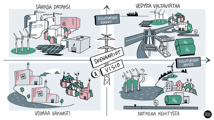 Sähköjärjestelmävision tavoitteena on tukea sähköjärjestelmän ennakoivaa kehittämistä kohti puhdasta, varmaa ja Euroopan kilpailukykyisintä sähköjärjestelmää. Visio tarkastelee Suomen sähköjärjestelmän kehitystä vuoteen 2040 neljän eri skenaarion kautta. Skenaarioissa kasvava asiakaskysyntä nostaa sähkön siirtotarvetta jopa moninkertaiseksi nykyisestä, mikä vaatii merkittäviä vahvistuksia kantaverkkoon aiemmin julkistetun seuraavan kymmenen vuoden kehittämissuunnitelman lisäksi. Korkeimmissa kasvuskenaarioissa vahvistustarpeet kasvavat tuhansiin kilometreihin.