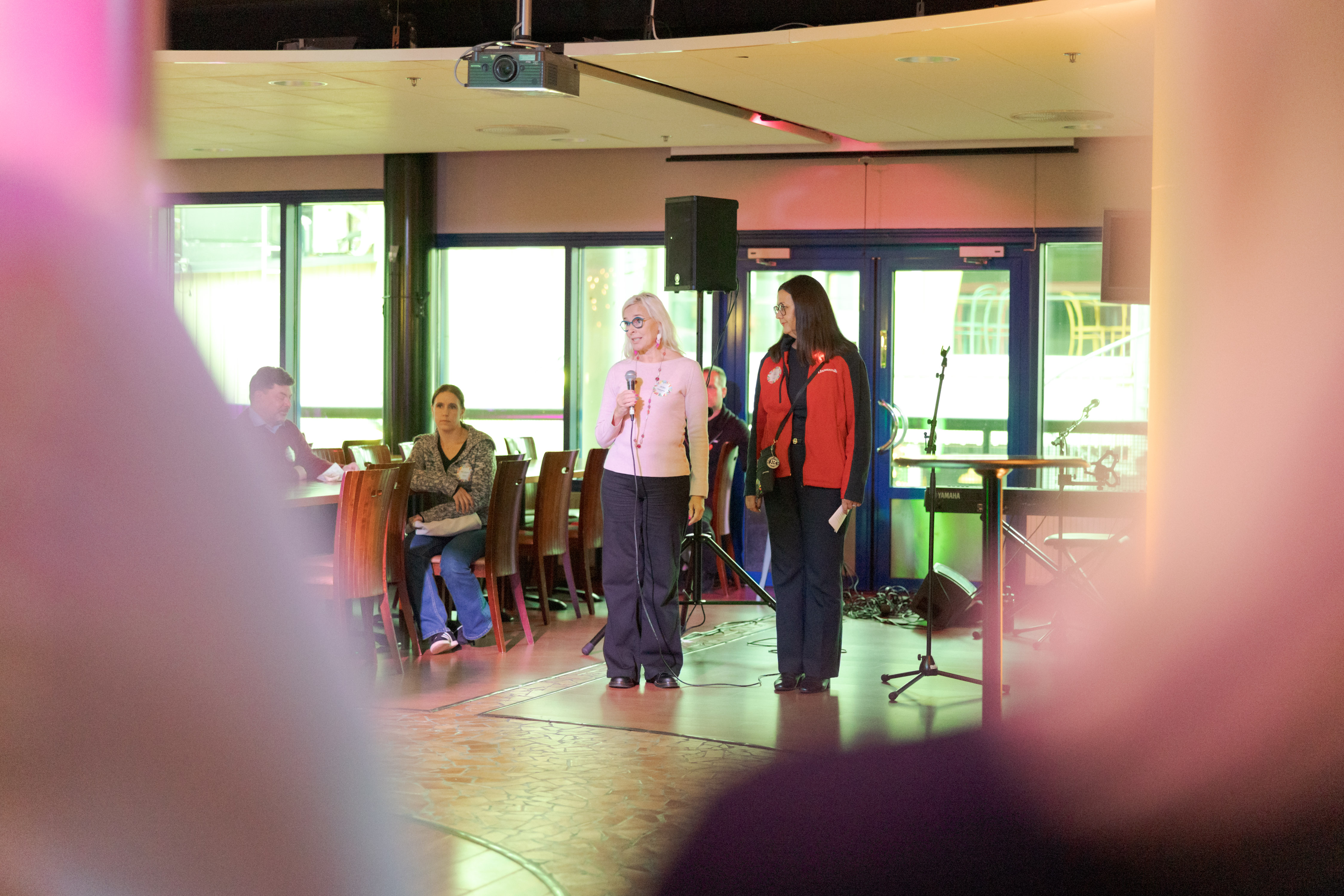 Parasta Lapsille -järjestön toiminnanjohtaja Sari Nikula ja Linnanmäen toimitusjohtaja Satu Järvelä iloitsivat Valokarnevaalin ennakkotilaisuudessa 3,8 miljoonan euron avustuksesta lastensuojelutyöhön.