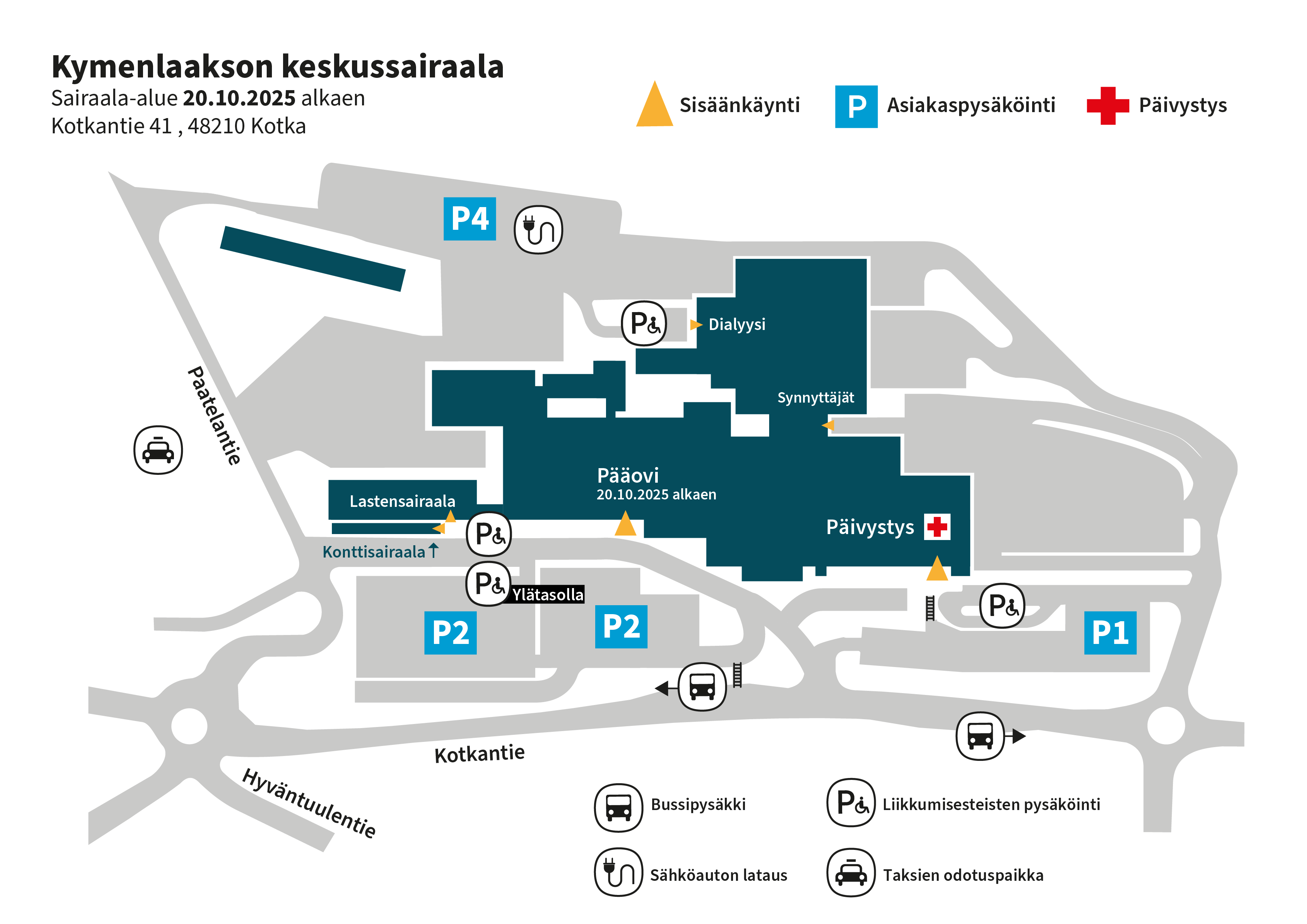 Sairaalan pääovelle ajetaan 20.10.2025 kello 6 alkaen vain Kotkantien kautta. Autolla tulevia pyydetään huomaamaan, että liikenne sairaalan edustalla on yksisuuntaista. Pääoven läheisyydessä on runsaasti parkkitilaa sekä useita 15 minuutin saattopaikkoja. Niin kutsuttu kallioparkki sairaalan eteläpäädyssä poistuu asiakaskäytöstä, kun uusi pääovi avataan.