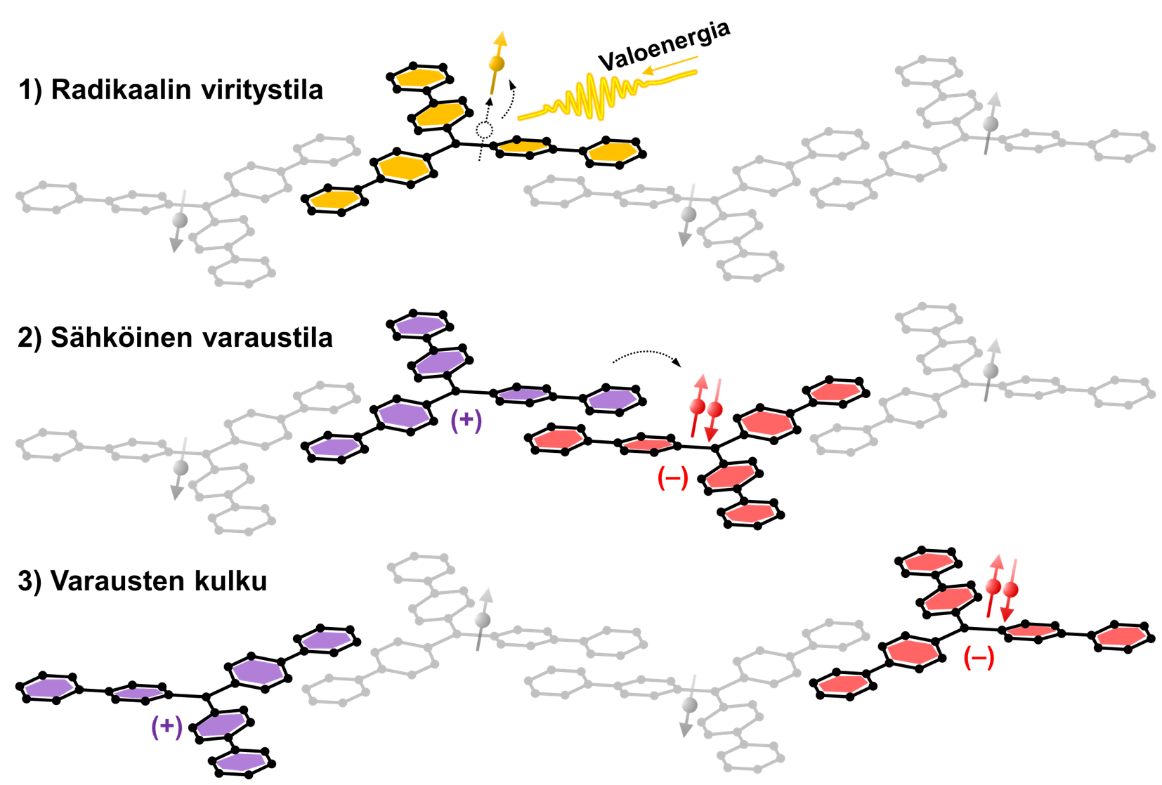 Aalto-yliopiston, Cambridgen yliopiston ja muiden kansainvälisten kumppaneiden yhteistutkimuksessa on osoitettu, että hiilipohjaisista orgaanisista radikaaleista voidaan valmistaa uudenlaisia puolijohteita, jotka muuttavat kaiken absorboidun valon sähkövarauksiksi.