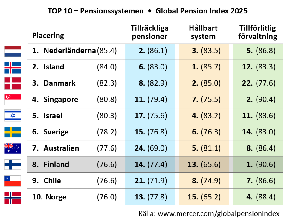 Ur ett nordiskt perspektiv kommer den årliga Mercer-jämförelsen med en stor överraskning. Hittills har Finlands pensionssystem fått bättre poäng än Sveriges. Men nu har Sverige kört om Finland.
