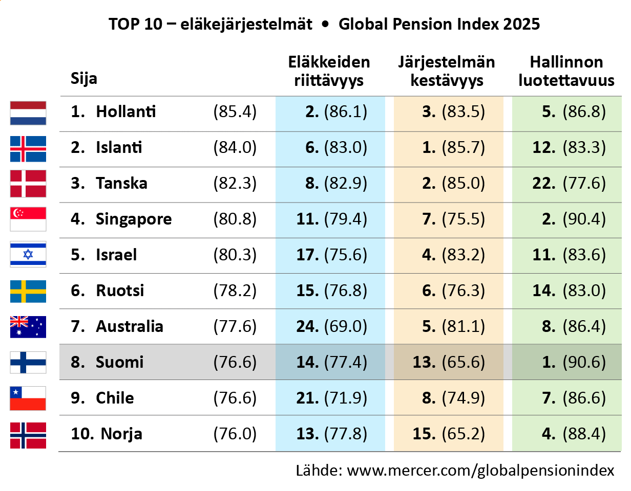 Taloudellisesti kestävin eläketurva löytyy Mercerin mukaan Islannista, Tanskasta ja Alankomaista. Yhteistä näille maille on täysin rahastoidut, maksuperusteiset eläkejärjestelmät, jotka kattavat valtaosan työikäisestä väestöstä.
