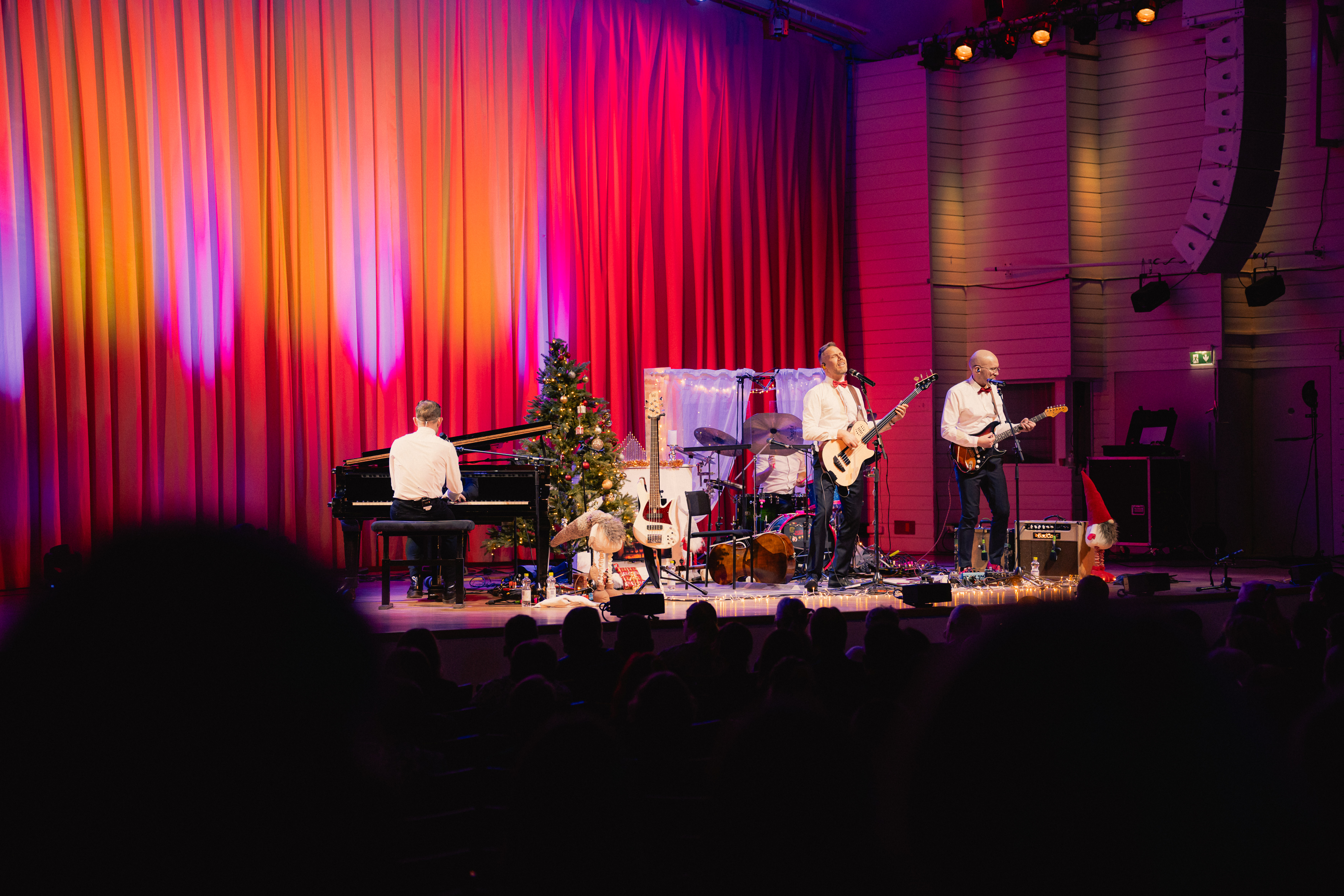 Neljän muusikon ryhmä punaisissa ruseteissa hymyilee kameralle joulukoristeiden keskellä.