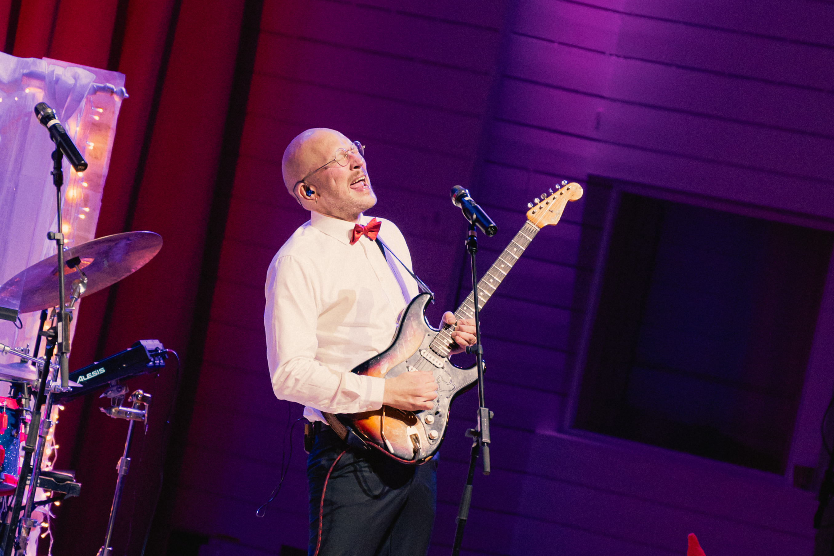 Muusikko soittaa sähkökitaraa intohimoisesti lavalla.