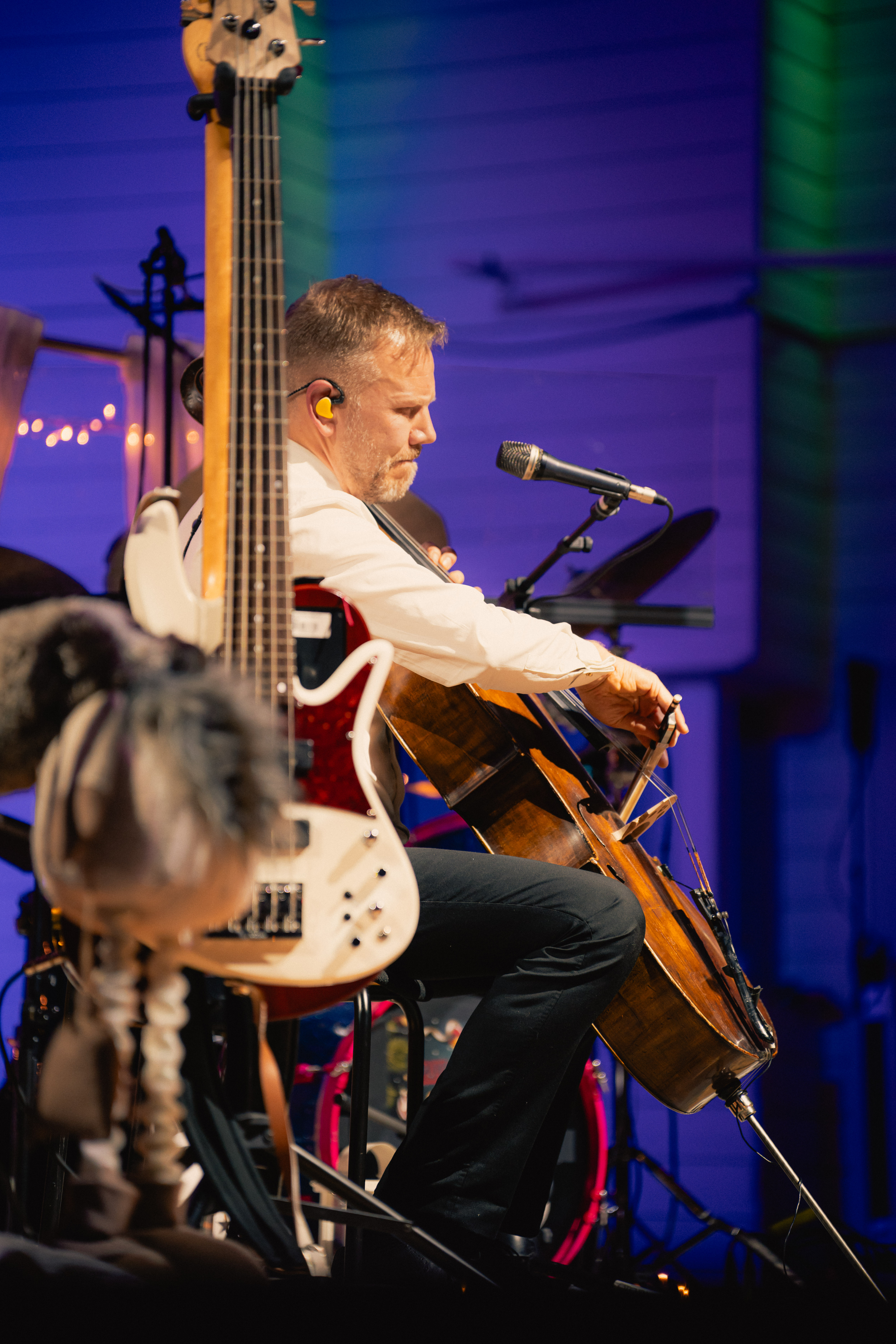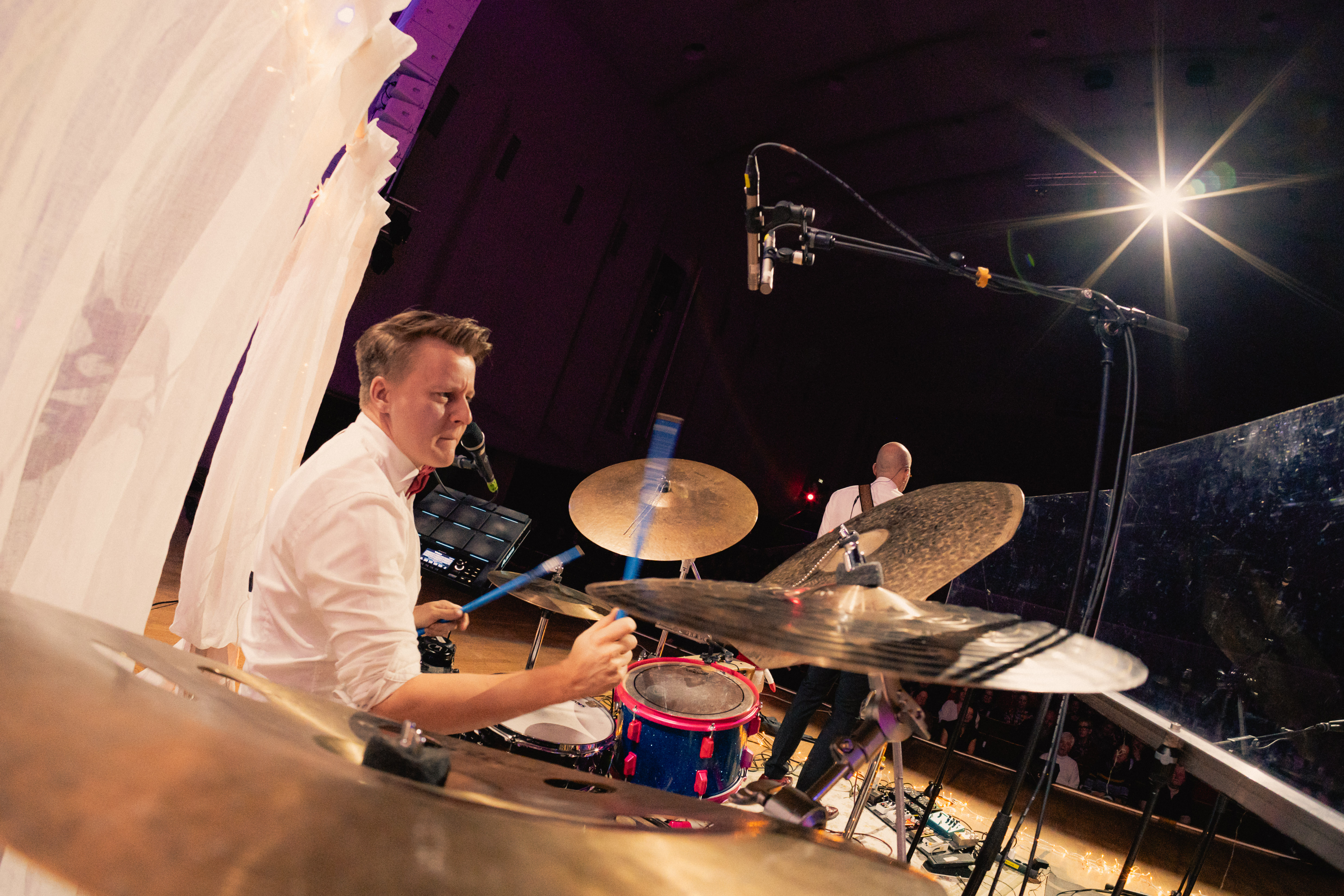 Konserttiesitys Turun Konserttitalon lavalla värikkäiden valojen loisteessa.