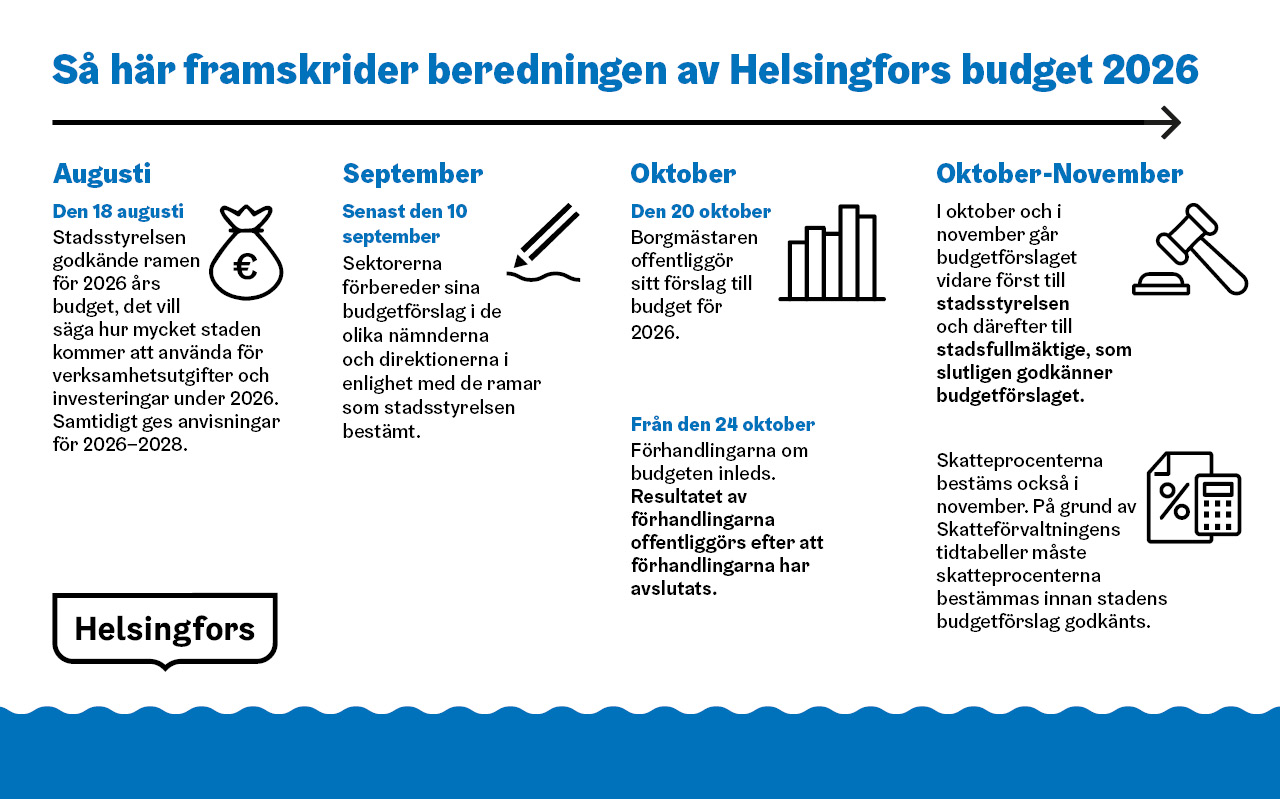 I november går budgetförslaget först vidare till stadsstyrelsen och därefter till fullmäktige för behandling. På webbplatsen Hel.fi/budgeten kan du följa med hur budgetprocessen framskrider. Borgmästarens presskonferens inleds 20.10.2025 kl. 12 och kan ses på Helsingforskanalen www.helsinkikanava.fi, där också en inspelning, med textning på finska, svenska och engelska, publiceras senare.