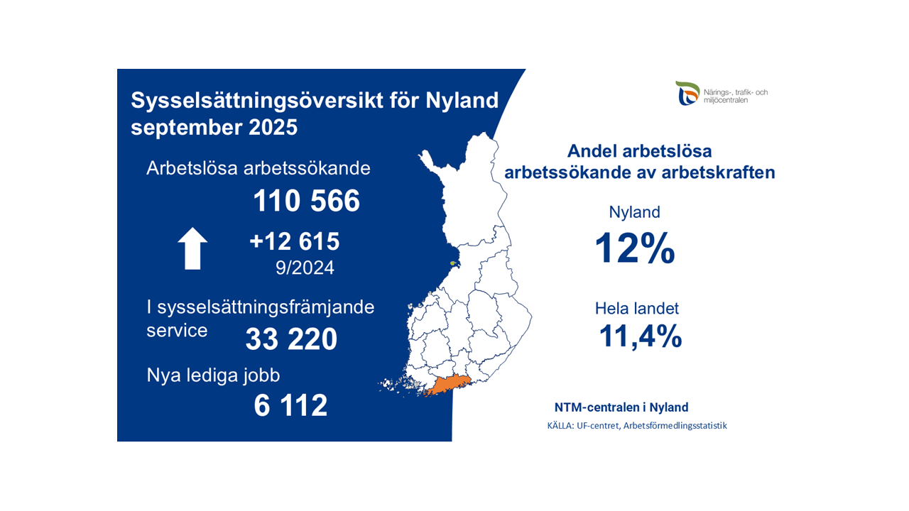 Av alla NTM-centralers områden ökade arbetslösheten tredje snabbast i Nyland efter Tavastland och Åland. I slutet av september fanns det i Nyland 110 566 arbetslösa arbetssökande, varav 4 435 var permitterade.