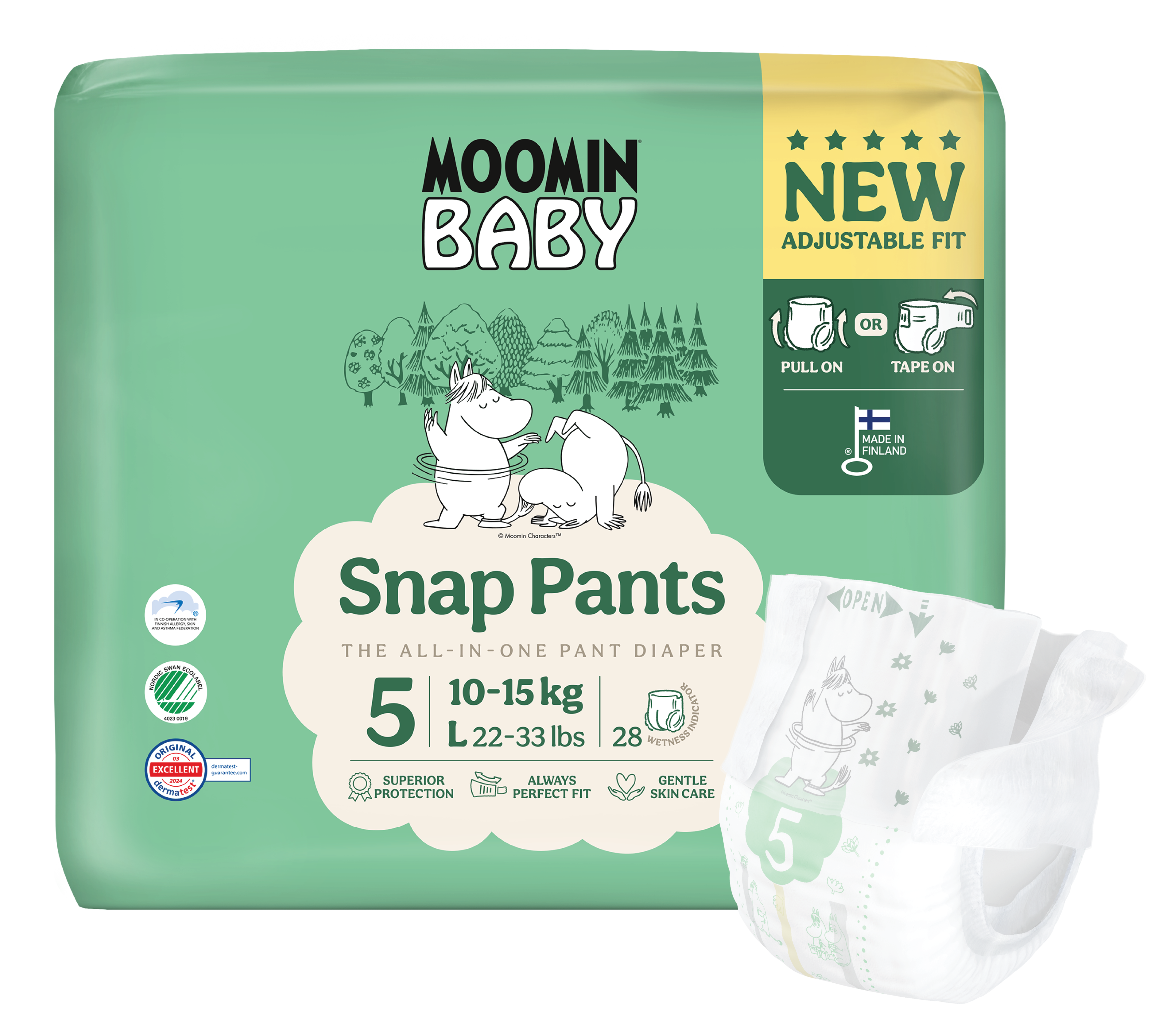 Tammisaaressa, Suomen ainoassa vaippatehtaassa vastuullisesti valmistetut Moomin Baby Snap Pants -housuvaipat saapuvat kauppoihin vaippakoko kerrallaan joulukuusta alkaen. Snap Pants -innovaatio yhdistää housu- ja teippivaipan parhaat ominaisuudet, sillä uutuusvaipan avattavat ja suljettavat sivuteipit mahdollistavat housuvaipan vyötärön koon säätämisen aina lapselle täydellisesti istuvaksi.