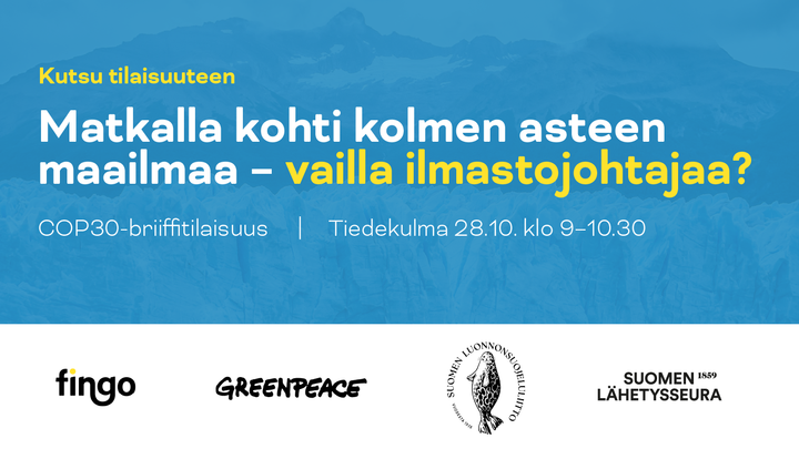 Kutsu COP30-briiffitilaisuuteen: “Matkalla kohti kolmen asteen maailmaa – vailla ilmastojohtajaa?”