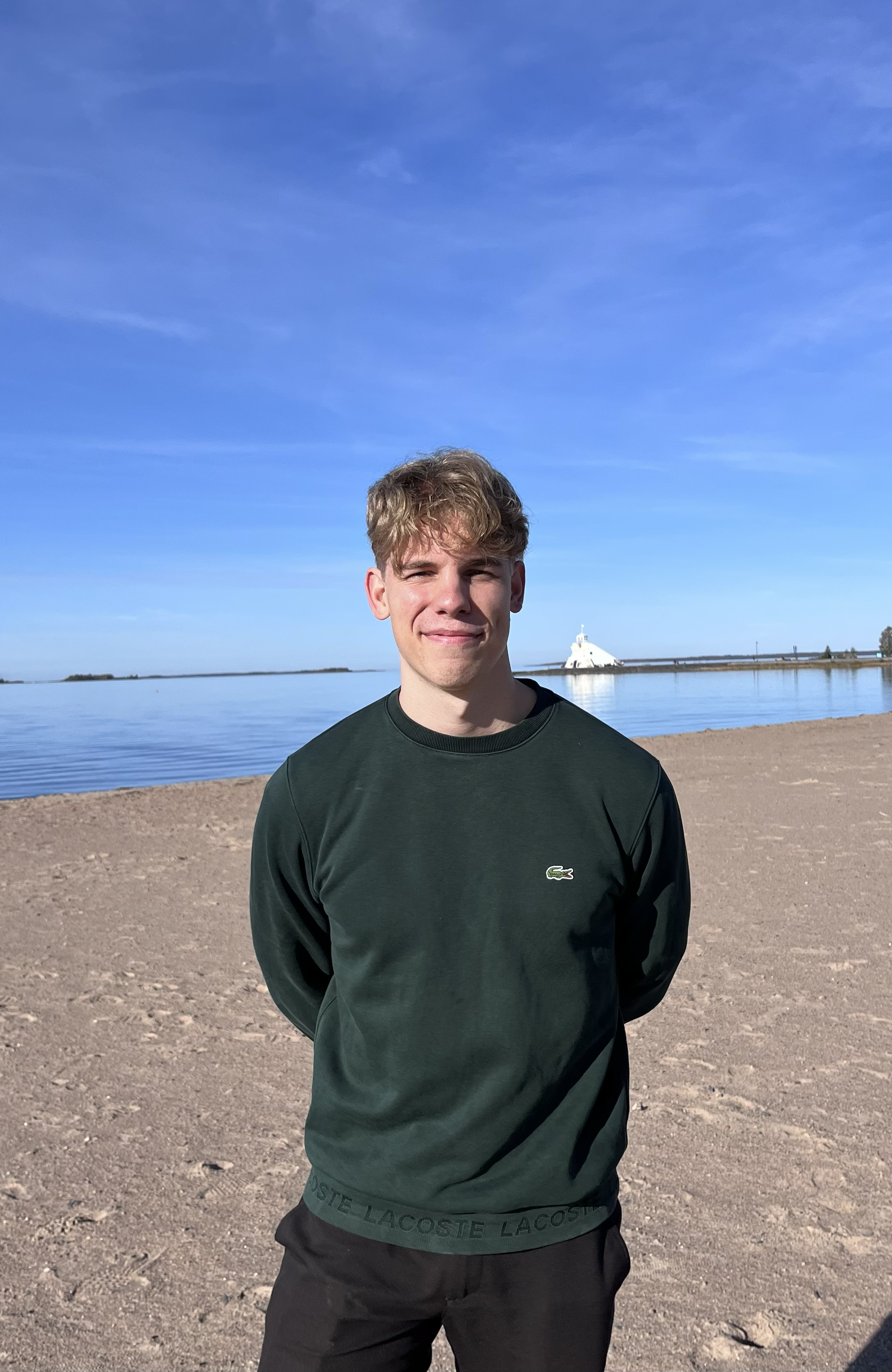 Konsta Koivunen lähikuvassa ulkona rannalla.