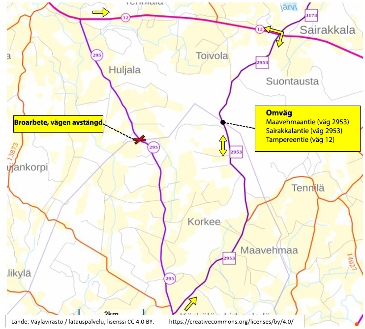 Trafiken dirigeras till en omväg via Tampereentie (väg 12), Sairakkalantie (väg 2953) och Maavehmaantie (väg 2953). Omvägen är cirka 27,4 km lång.