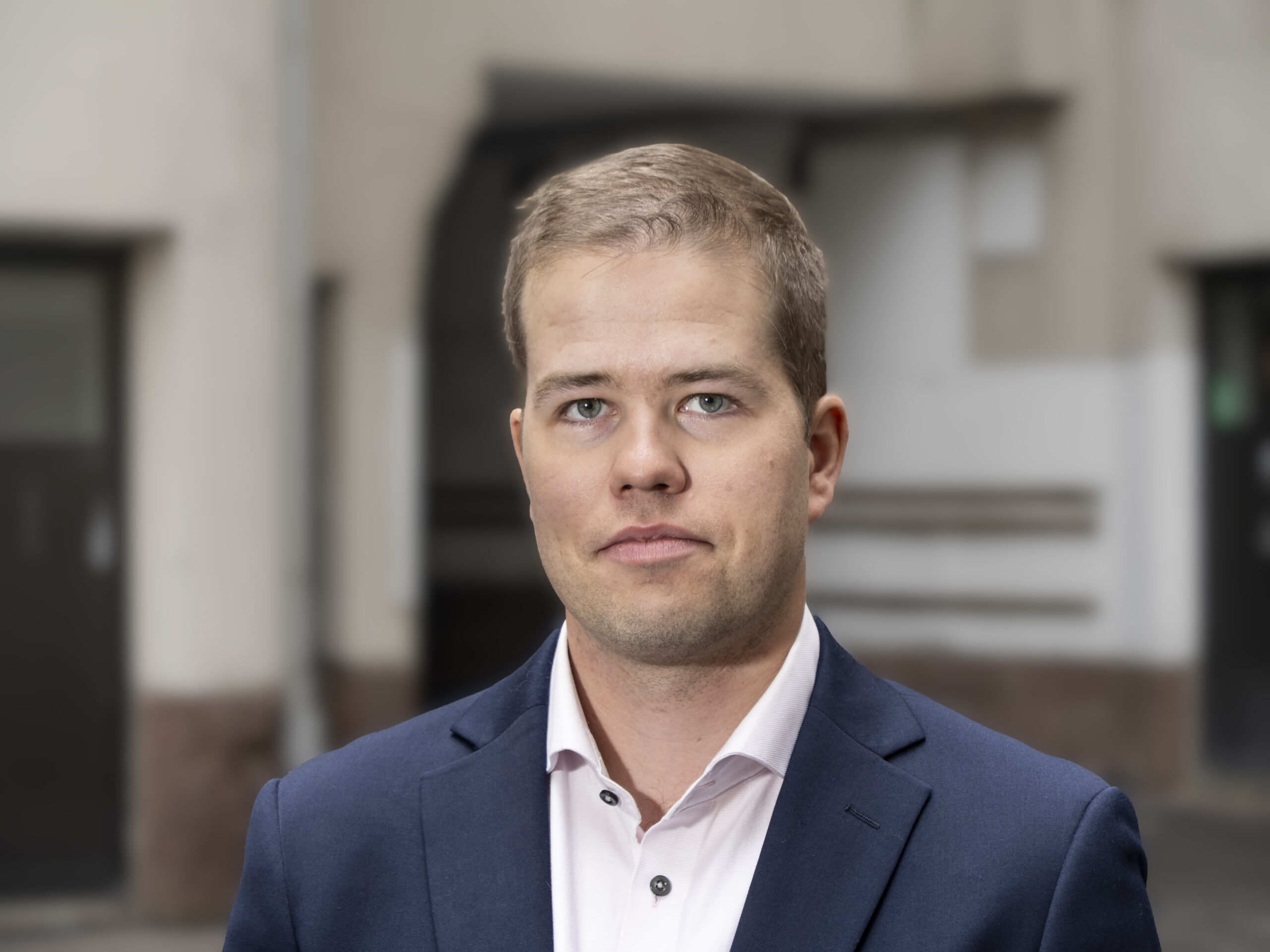 En man i kostym står framför en suddig bakgrund.