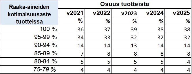 Raaka-aineiltaan lähes 100 prosentin tuotteita on 32 %. Näissä tuotteissa ulkomaisia ainesosia ovat yleisimmin suola ja mausteet, kuten marinoiduissa lihoissa sekä juustoissa. Osassa leivistä suolan lisäksi ulkomaisia ovat siemenet.