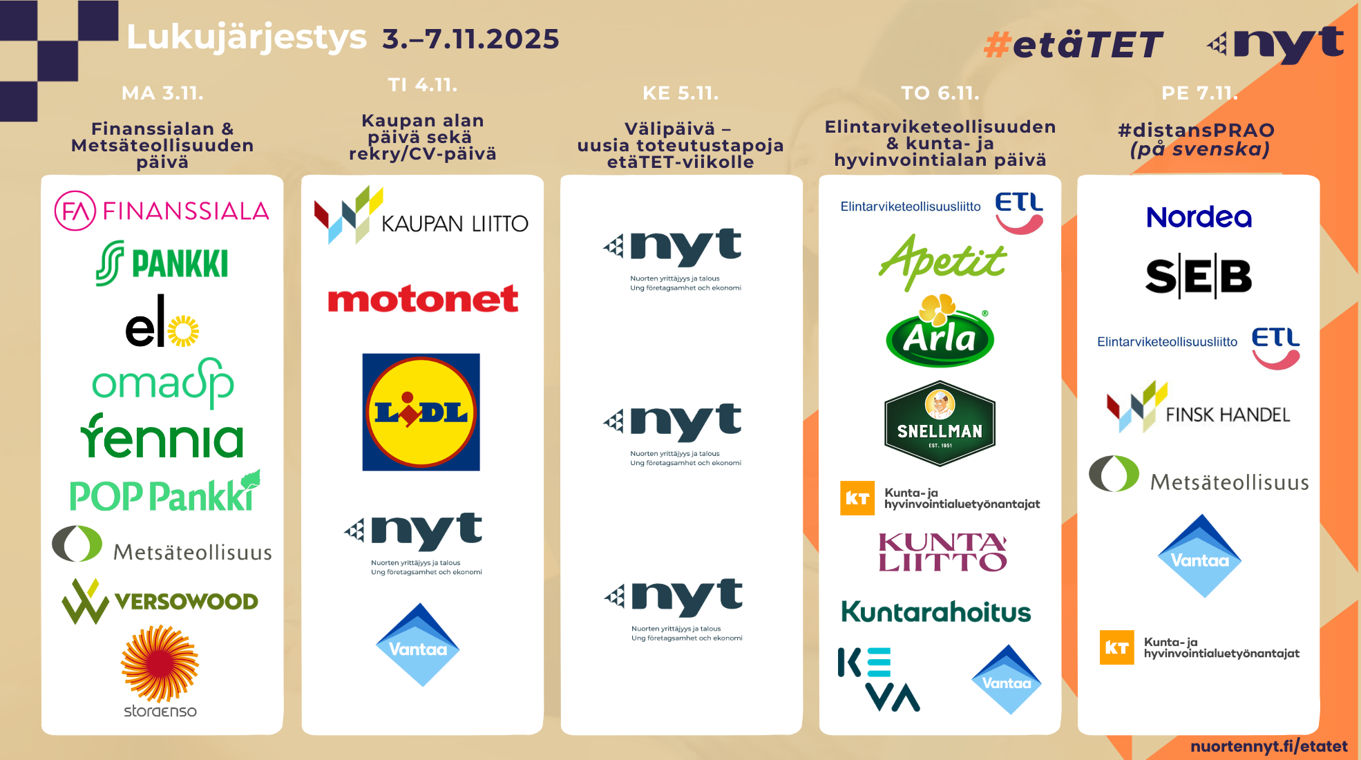 Mitä kaikkea tarjoaa yksi viikko työelämässä parinkymmenen eri työnantajan hommissa? Nuorten yrittäjyys ja talous NYT -järjestön Maailman suurin etäTET kokoaa tuhannet nuoret yhteiselle, ainutkertaiselle TET-jaksolle 3.–7. marraskuuta. Maanlaajuinen TET tarjoaa monipuoliset tutustumismahdollisuudet työelämään myös pienten paikkakuntien nuorille. Ovensa tettiläisille avaavat elintarvike-, kunta- ja hyvinvointi-, metsä-, finanssi- ja kaupan alan toimijat.