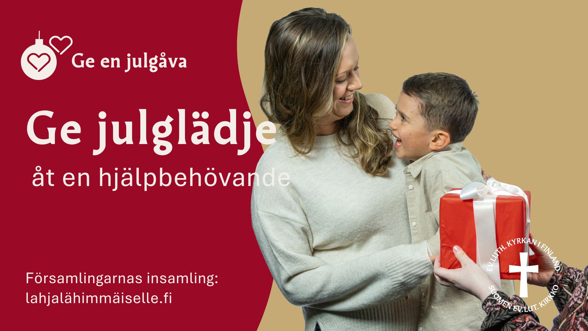 Ge en julgåva är huvudstadsregionens evangelisk-lutherska församlingars gemensamma välgörenhetskampanj, som tidigare kallades Klä julgranen. Insamlingsobjektet är fysiska presentkort, vars belopp donatorn själv kan bestämma. Presentkort önskas i synnerhet till stora dagligvarubutiker, eftersom de är allra mest mångsidiga för olika behov. Insamlingstiden är 13.11–7.12.2025. Det finns sammanlagt cirka 40 verksamhetsställen i huvudstadsregionen dit presentkorten kan föras. Dessa mottagningsplatser hittas på adressen lahjalahimmaiselle.fi/pasvenska.