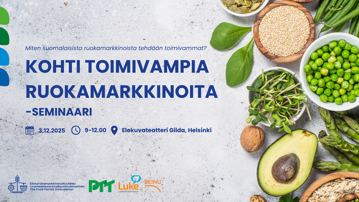 Tervetuloa Elintarvikemarkkinavaltuutetun toimiston ja Ruokaketjun toimivuus ja arvonmuodostus -hankkeen yhteistyössä järjestämään Kohti toimivampia ruokamarkkinoita -seminaariin keskiviikkona 3.12.2025.