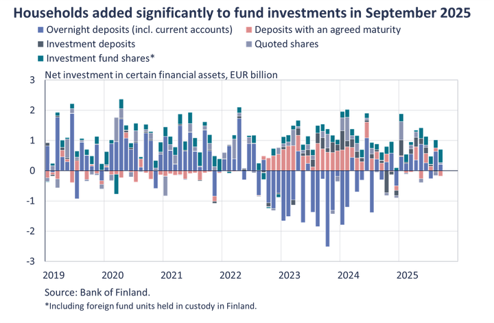At the end of September 2025, households’ holdings of quoted shares[4] totalled EUR 54.8 billion, representing an increase of 9% year-on-year. During September 2025, households made net investments of EUR 47 million[5] in quoted shares. In addition, the value of these equity holdings increased by EUR 512 million in September.