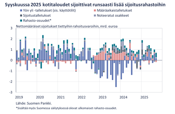 Syyskuussa 2025 suomalaiset kotitaloudet sijoittivat suomalaisten sijoitusrahastojen lisäksi 62 milj. euroa lisää ulkomaisiin sijoitusrahastoihin[2], joten yhteensä kotitaloudet tekivät merkintöjä sijoitusrahastoihin 438 milj. euron edestä. Syyskuun lopussa myös kotitalouksien rahasto-osuusomistukset ulkomaisista sijoitusrahastoista (9,9 mrd. euroa) olivat suurimmillaan kautta aikojen. Kotitalouksien sijoituksista ulkomaisiin rahastoihin suurin osa (77 %) oli osakerahastoissa. Lisäksi kotitalouksilla on merkittävä määrä sijoituksia kotimaisiin ja ulkomaisiin sijoitusrahastoihin sijoitussidonnaisten vakuutussopimusten kautta[3].