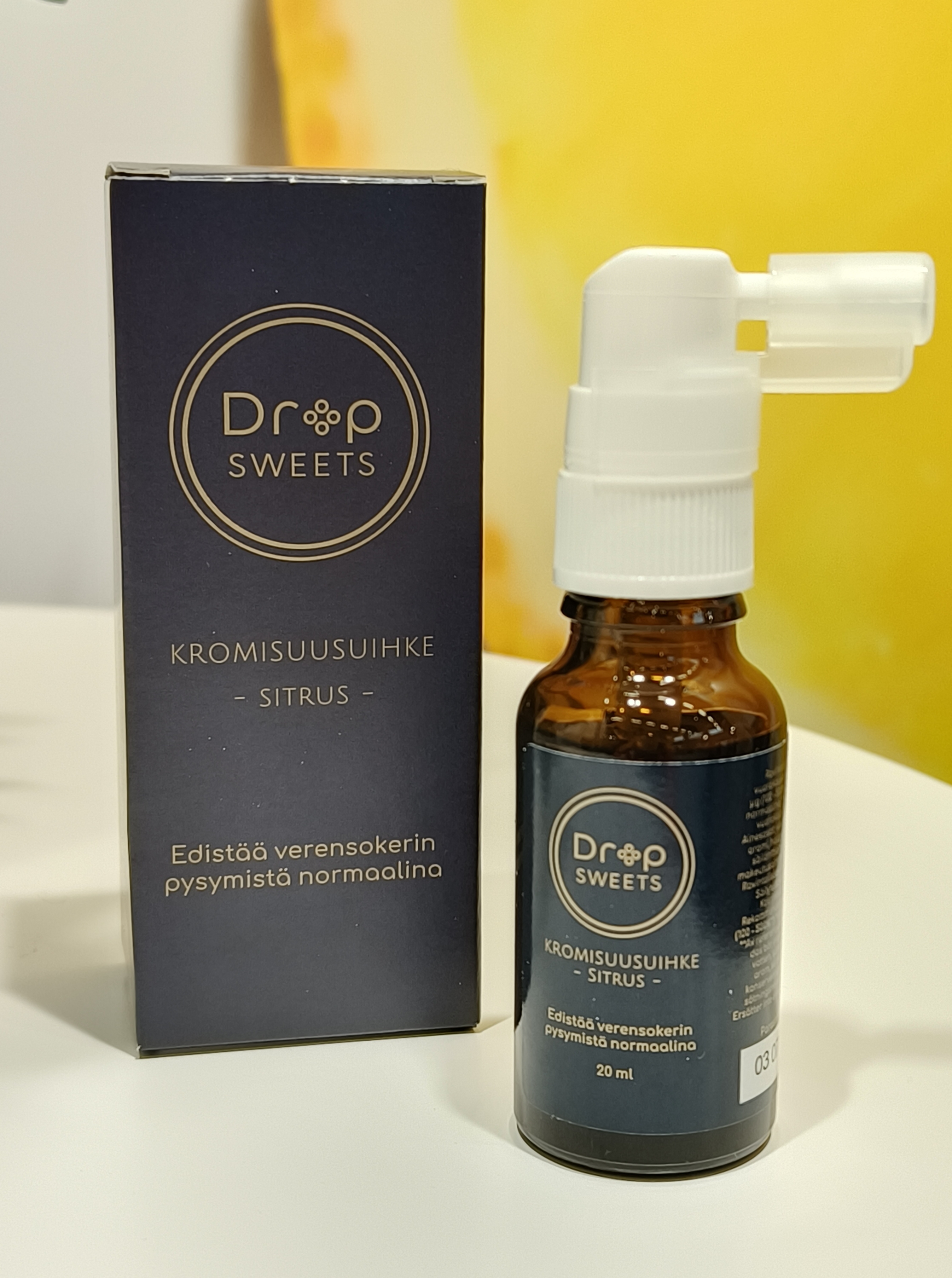 Suomalainen startup-yritys on kehittänyt kromisuihkeen, joka tasapainottaa verensokeria kromitabletteja tehokkaammin. Ravintolisä imeytyy suun limakalvoilta suoraan verenkiertoon. Tasainen verensokeri helpottaa painonhallintaa, sillä makeanhimo on selkein tuntemus verensokerin vaihtelusta.