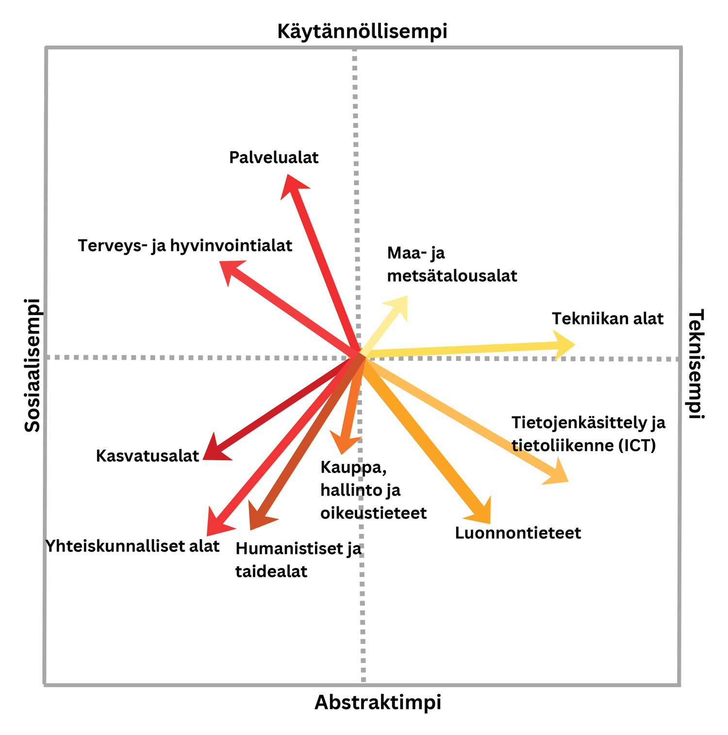 Koulutusalojen ryhmittyminen kahden geneettisen ulottuvuuden mukaan. Vaaka-akseli erottaa tekniset alat sosiaali-, kasvatus- ja terveysaloista, kun taas pystyakseli erottaa käytännönläheiset alat teoreettisemmista. Tulos perustuu pääkomponenttianalyysiin.  Se on tilastollinen menetelmä, jota käytetään, kun halutaan tiivistää monimutkaista tietoa muutamaan tärkeimpään suuntaan, jotka kuvaavat aineiston suurimpia eroja.