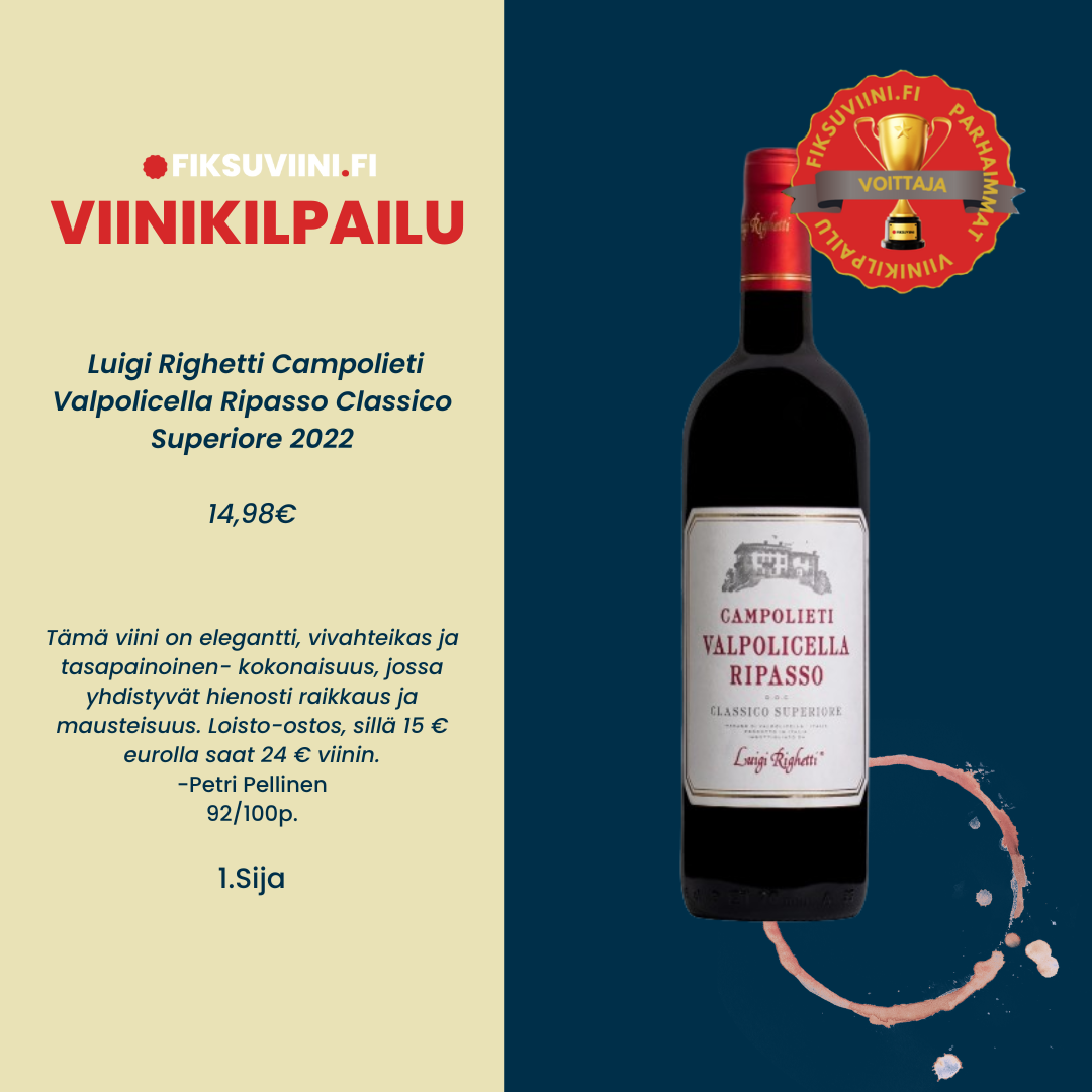 Luigi Righetti Campolieti Valpolicella Ripasso Classico Superiore 2022 tarjoaa sellaista laatua ja hienostuneisuutta, että on vaikea uskoa sitä saatavan alle 15 euron hintaan."