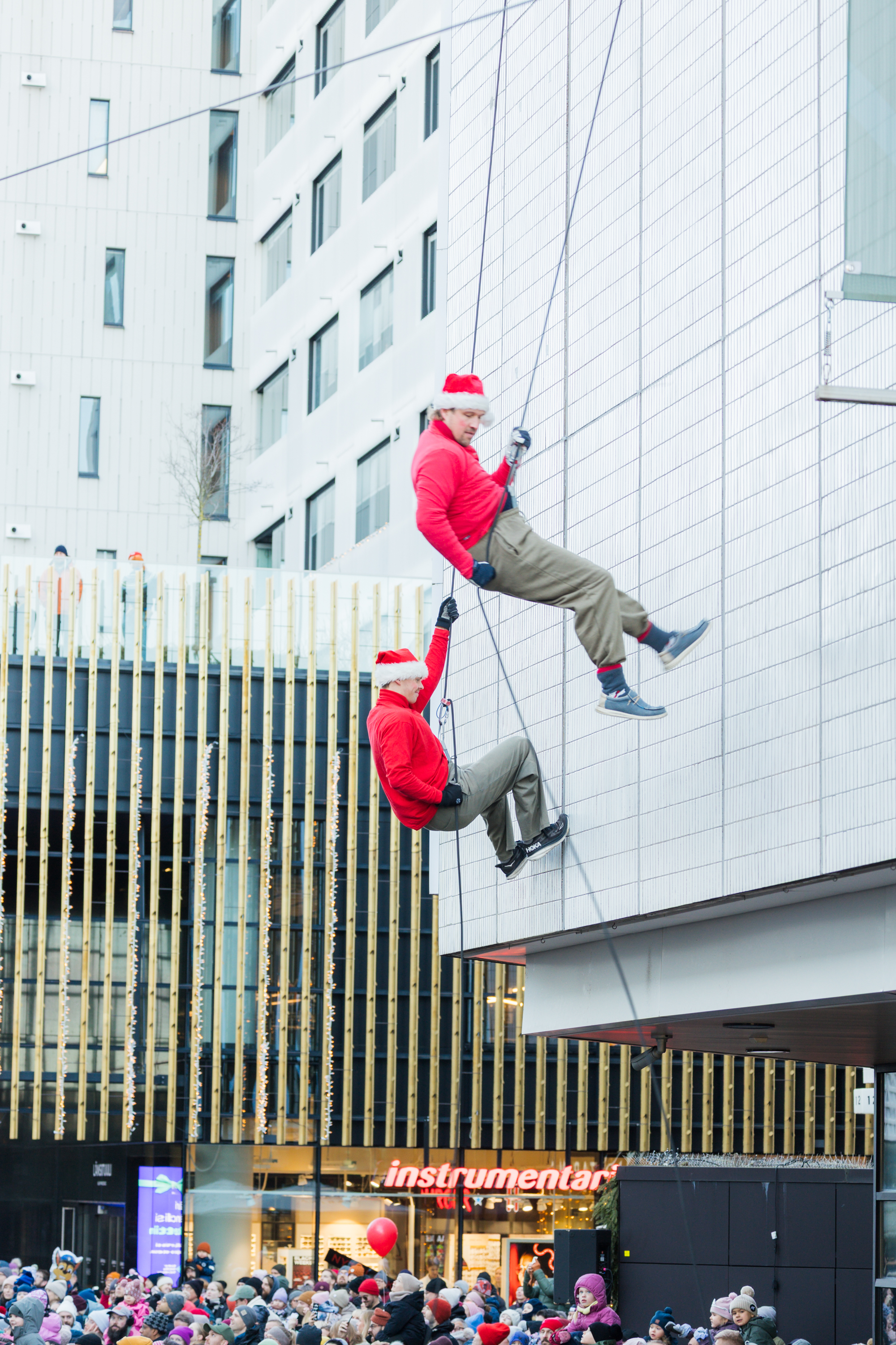 Aamu alkoi Tapiolan kuoron joululauluilla, minkä jälkeen iki-ihanat Pikku Myy, Muumipeikko ja Nipsu toivat lavalle talvisen tarinan Muumilaaksosta. Sitten koitti hetki, jota kaikki odottivat: Korvatunturilta saapuneet tontut laskeutuivat köysien varassa katolta ja Joulupukki liukui ilmojen halki tervehtimään väkijoukkoa. Huudahdukset, taputukset ja lasten iloiset kiljahdukset täyttivät kävelykadun.