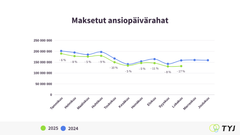 | Ansiopäivärahakulut | 132 milj. € | – 17 % | 158 milj € |