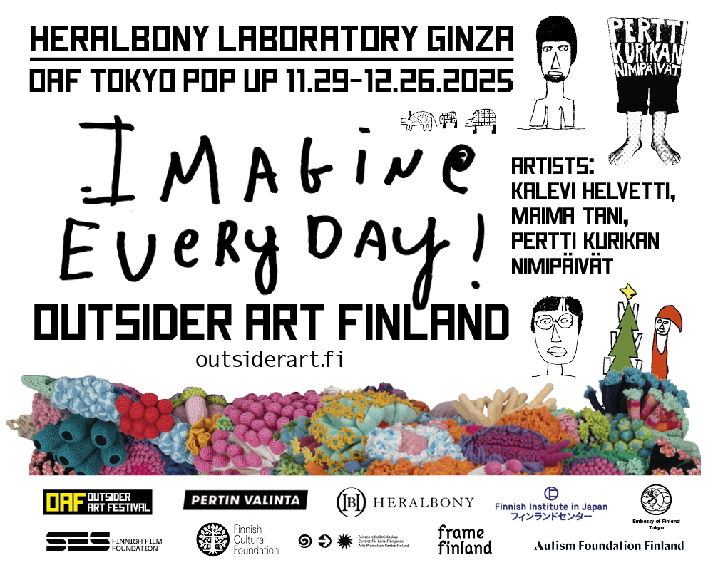 Suomalaisen outsider-taiteen tapahtumakokonaisuus IMAGINE EVERYDAY! Outsider Art Finland toteutetaan yhteistyössä HERALBONY:n, Pertin Valinnan ja Suomen Japanin instituutin kanssa Tokiossa 29.11.-26.12.2025. Tämä ainutlaatuinen yhteistyö tuo Outsider Art Finland tapahtumat Tokioon, HERALBONY LABORATORY GINZAan, kutsuen kaikki kuvittelemaan osallistavampaa, monimuotoisempaa ja kestävämpää tulevaisuutta.