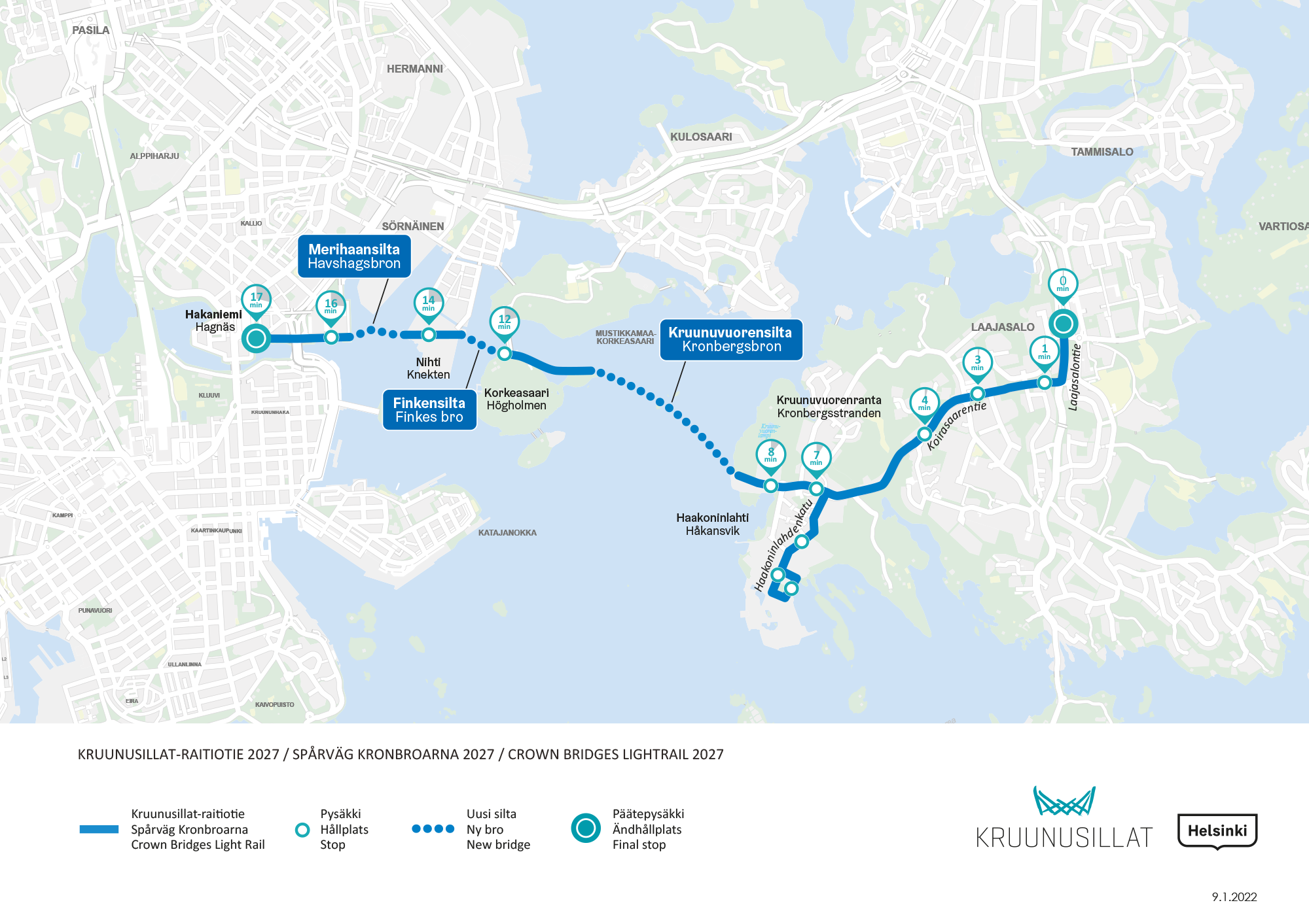 Kruunusillat-raitiotie Kruunusillat-raitiotie yhdistää Laajasalon, Korkeasaaren ja Kalasataman Helsingin keskustaan. Samalla se luo uuden merellisen reitin myös pyöräilijöille ja jalankulkijoille. Tavoitteena on aloittaa raitiotien matkustajaliikenne Laajasalon ja Hakaniemen välillä vuonna 2027.