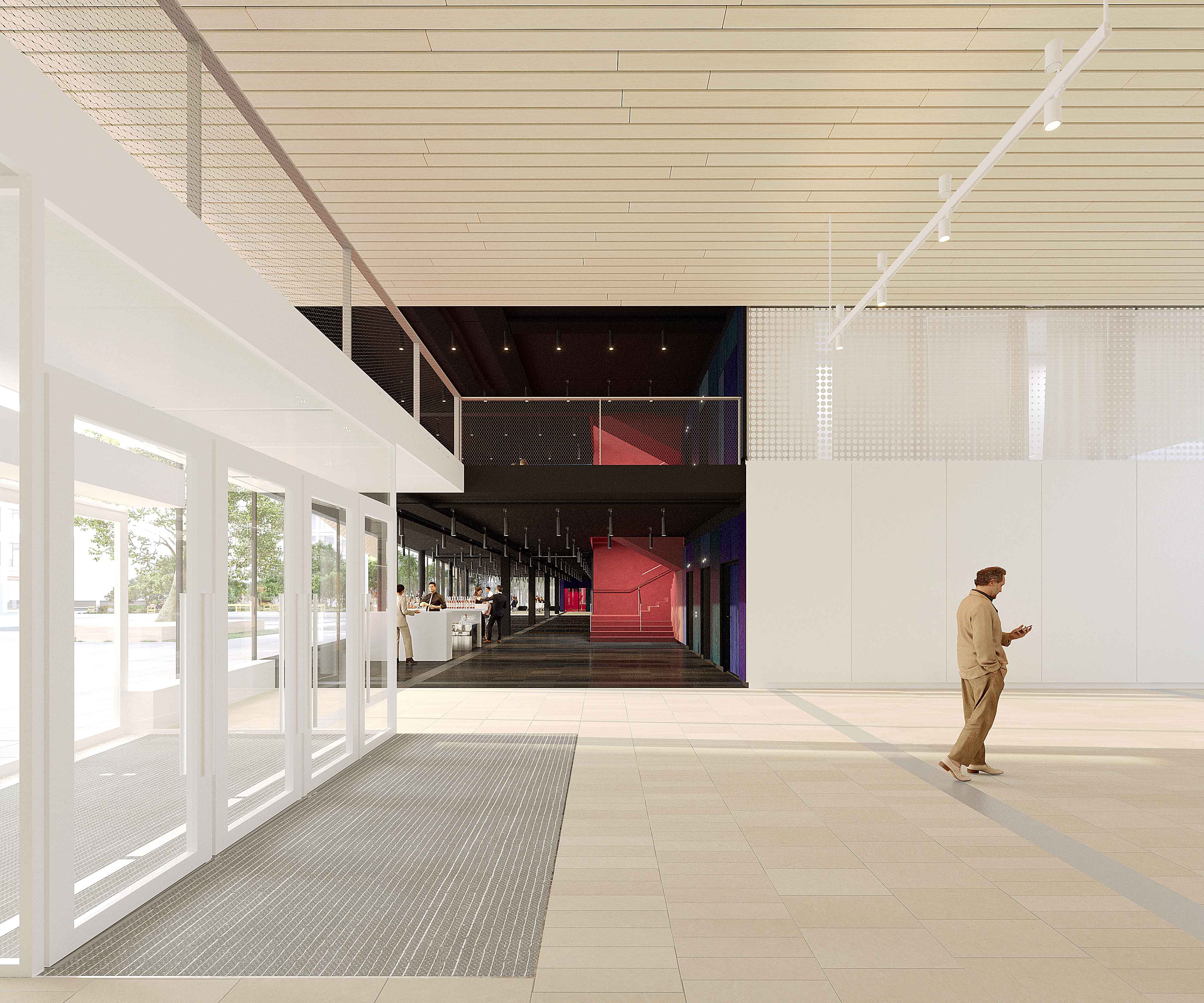Havainnekuva Espoon kulttuurikeskuksen galleriasta avautuvasta näkymästä teatterin aulaan, jossa näkyvät avarat tilat ja moderni sisustus.