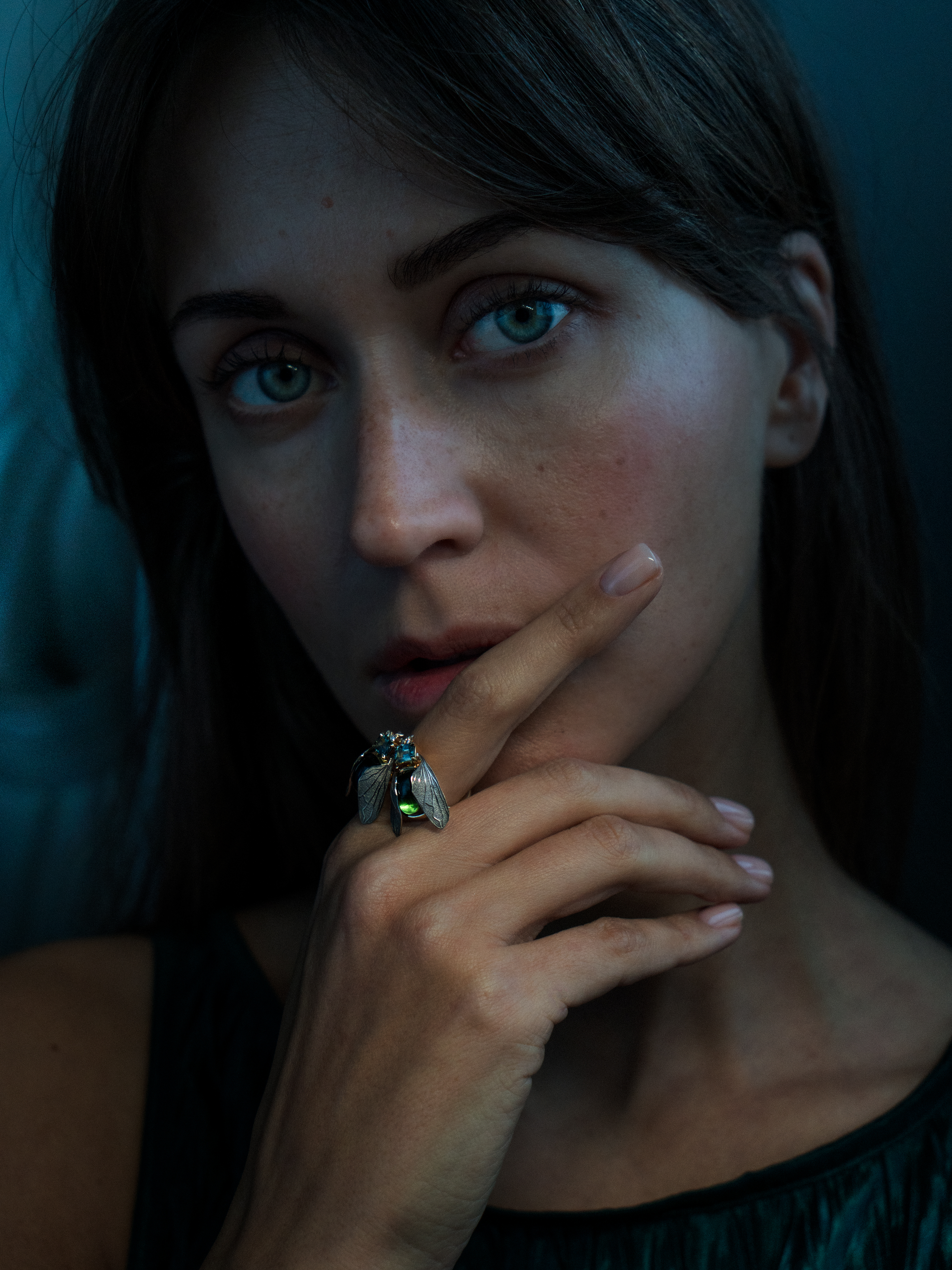 Jalokivet ovat kuin luotuja toistamaan hyönteismaailman sävyjä. Jalokivien kova kiilto ja viimeistellyt hionnat tuovat esiin hyönteisille tunnusomaisia pintoja ja värejä. Kulta ja platina korostavat kauniilla ja harkituilla elementeillään herkkiä ja linjakkaita muotoja, joita hyönteismaailmassa on loputtomasti. Kultasepän on helppo inspiroitua mikroskooppisen pienistä nivelistä, tuntosarvista, kennoista ja siipien ruodoista. Oma viehätyksensä on luoda iholle puettavaa kauneutta aiheesta, joka yleensä herättää inhoa.