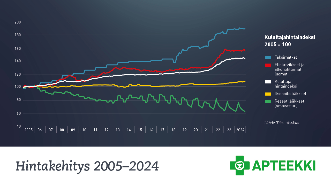 Reseptilääkkeiden kuluttajahinnat ovat 20 vuodessa laskeneet noin 40 prosenttia, kun taas kuluttajahinnat yleisesti ovat nousseet noin 46 prosenttia. Lähde: Tilastokeskus, kuluttajahintaindeksi.
