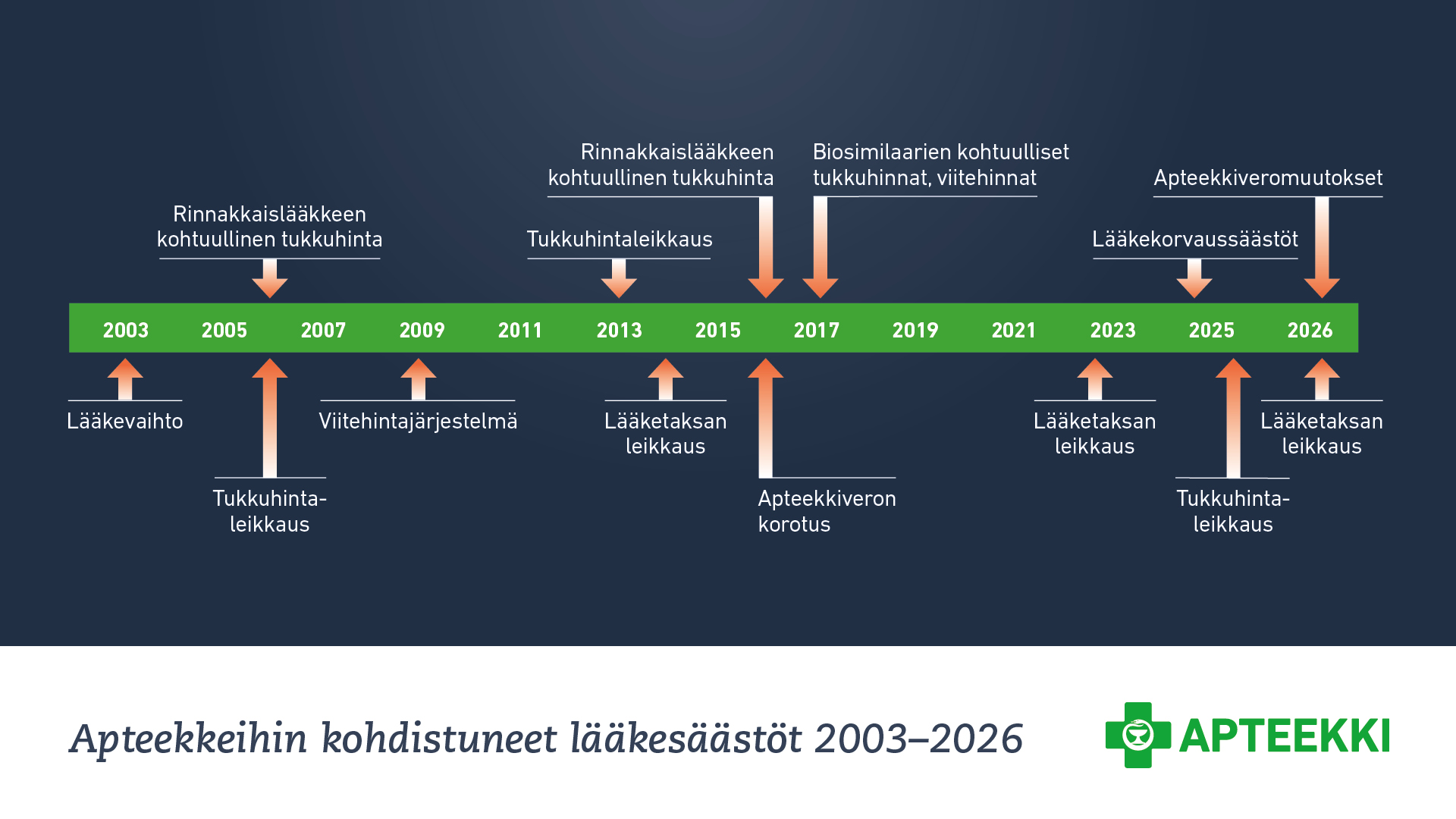 Apteekkeihin on koko 2000-luvun ajan kohdistettu useita lääkesäästöjä ja leikkauksia. Lisäksi apteekkien taloutta ovat heikentäneet kustannusten raju nousu 2020-luvulla sekä reseptilääkkeiden hintojen lasku.