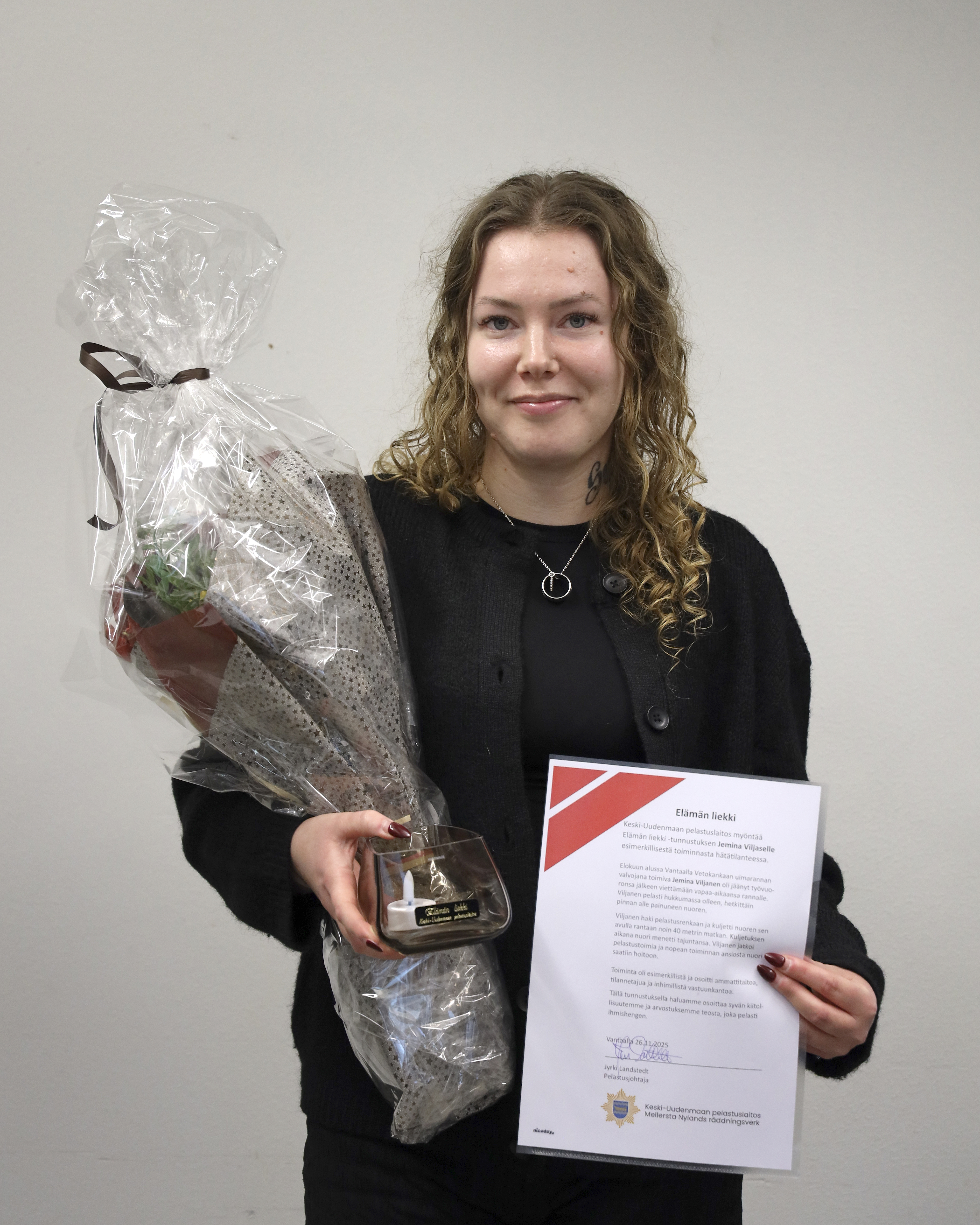 Keski-Uudenmaan pelastuslaitos on myöntänyt Elämän liekki -tunnustuksen Jemina Viljaselle, joka on toiminut poikkeuksellisen rohkeasti ja esimerkillisesti hätätilanteessa. Tunnustus myönnetään teosta, joka on pelastanut ihmishengen tai estänyt vakavan onnettomuuden.