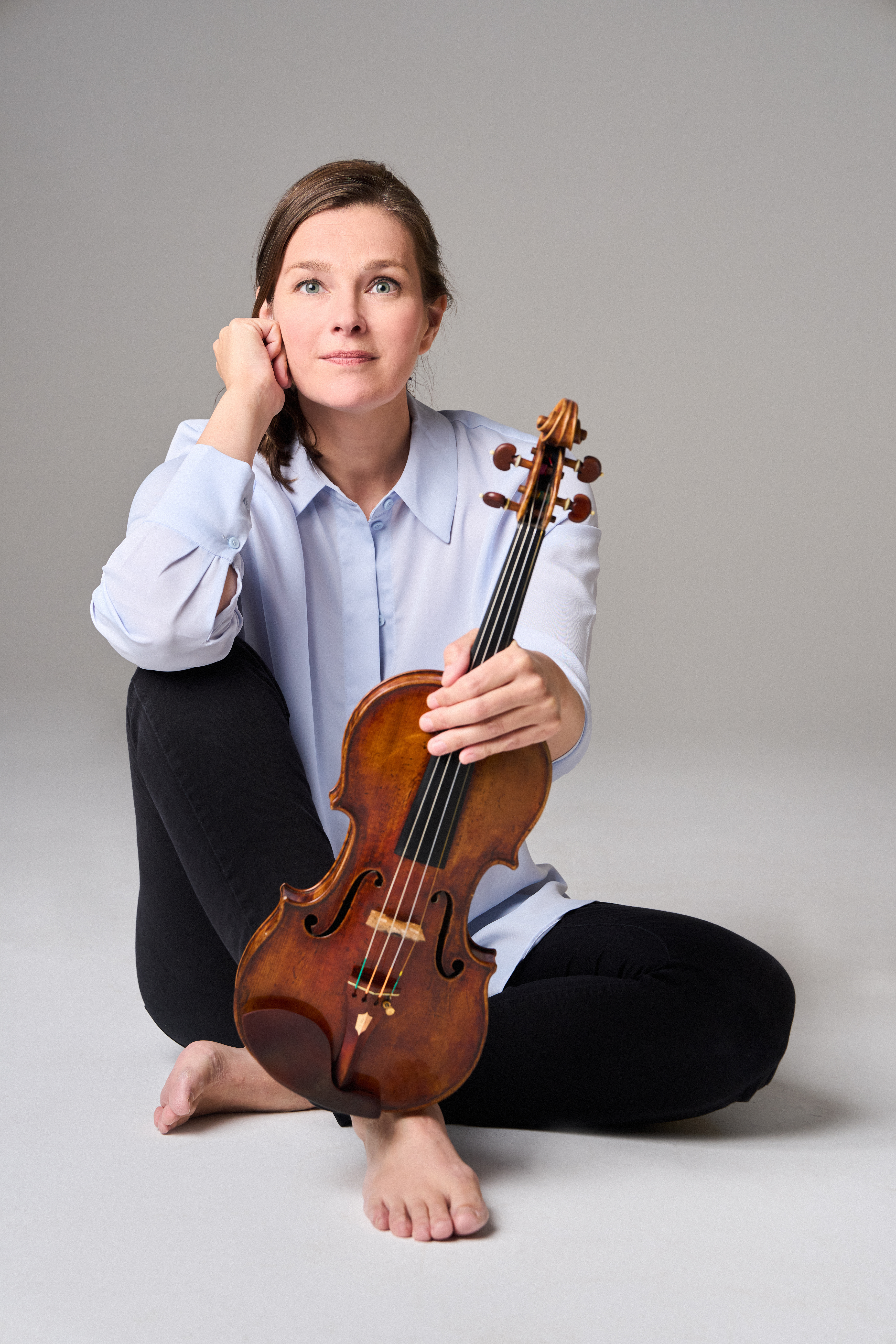 Janine Jansen istuu lattialla pitäen viulua sylissään.