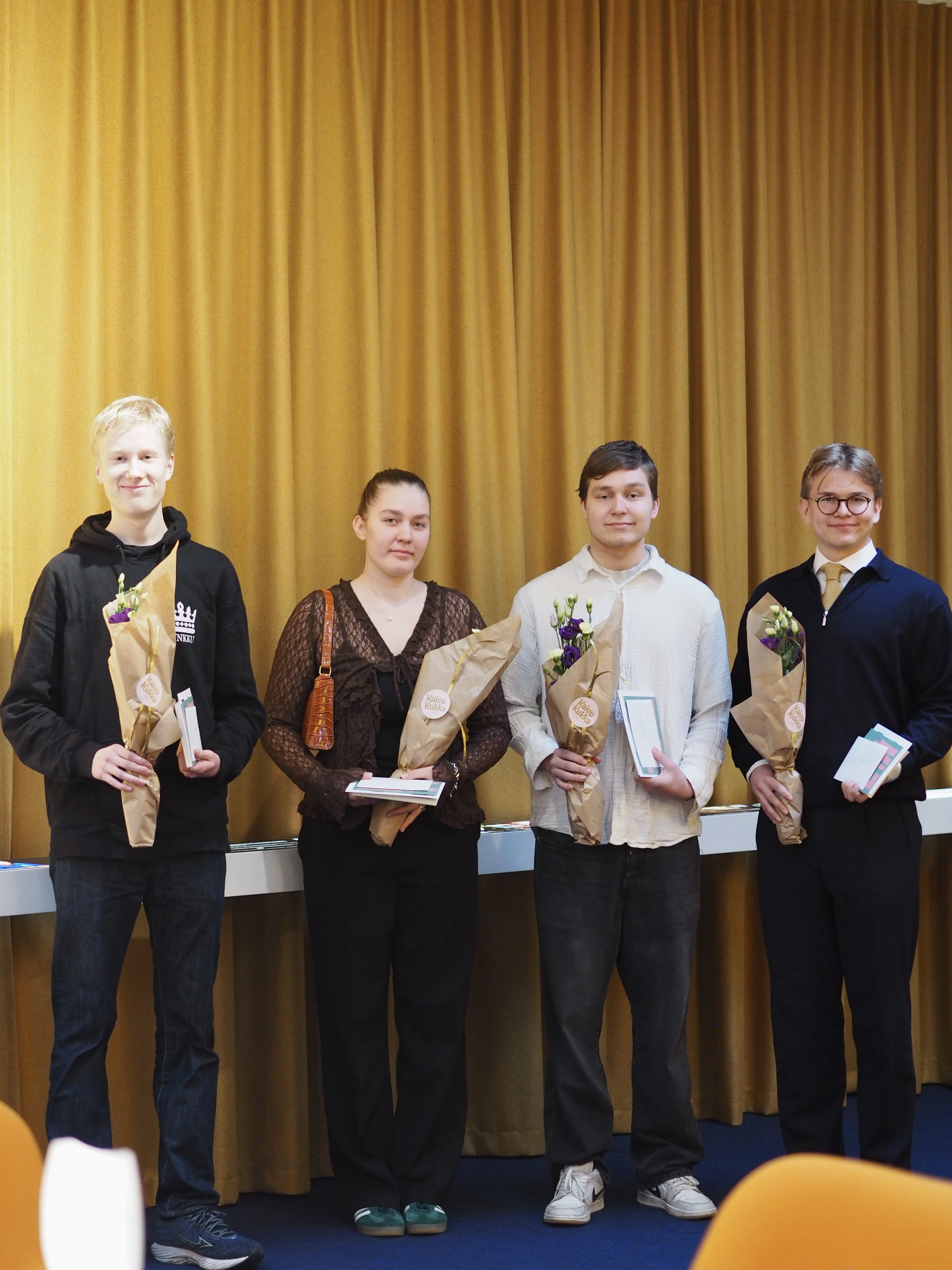 Författarna till de fyra vinnande bidragen premierades idag på Hanaholmen med var sitt presentkort på 150 euro till Akademiska bokhandeln. De får också en privat rundvandring i Svenska teaterns kulisser. De övriga finalisterna fick motta bokpriser.