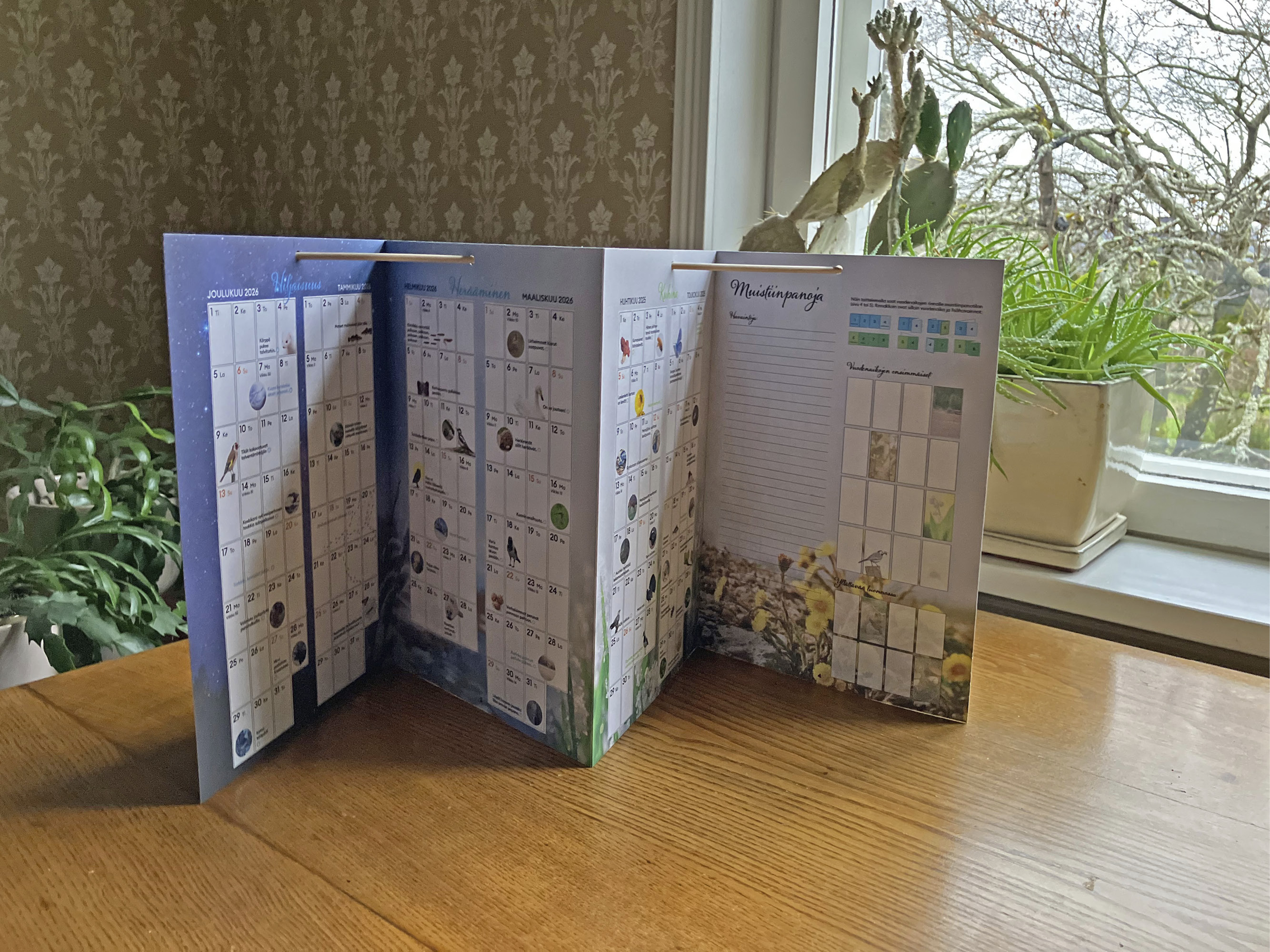 Kuusi vuodenaikaa -kalenterin voi laittaa pöydälle pystyasentoon