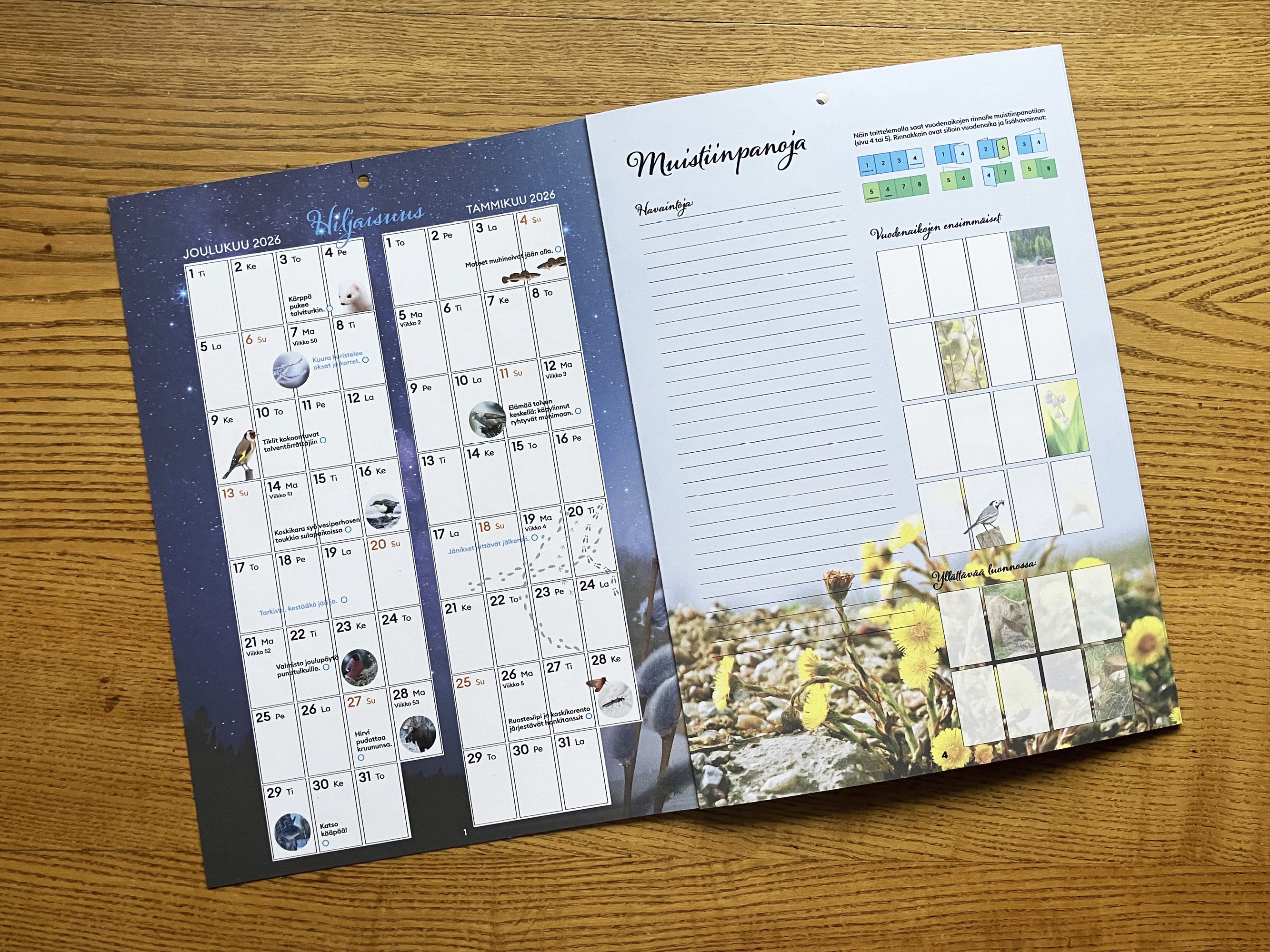 Vaikka vuodenajat ovat uudet, kuukaudet ovat edelleen samat kuin ennenkin, mikä helpottaa vuodenkierron hahmottamista. Kuusi vuodenaikaa -kalenteri auttaa iloitsemaan arjen havainnoista ja keskittymään katsomaan luontoa uudella tavalla.